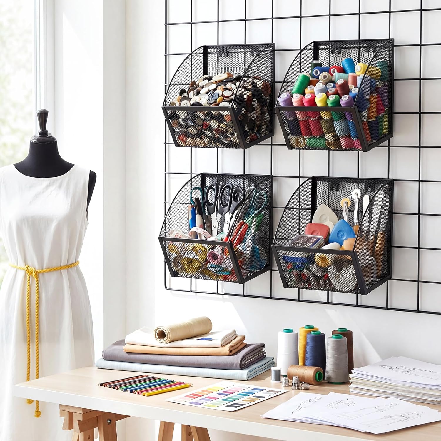 Features: Effortless organization: Equipped with easy-install hooks, these baskets instantly add versatile storage to any grid wall, helping you neatly organize various items without tools or hassle. Durable metal build: Crafted from sturdy metal, these long-lasting baskets reliably hold household items in various rooms, offering a robust and adaptable storage solution for kitchen, office, or garage. Specifications: Material: metal Color: black Size: 7.3 x 5.1 x 7.1 inches / 18.5 x 13 x 18 cm Package includes: 4 x Wire Baskets Notes: Manual measurement, please allow slight errors on size. The color may exist a slight difference due to different screen displays.