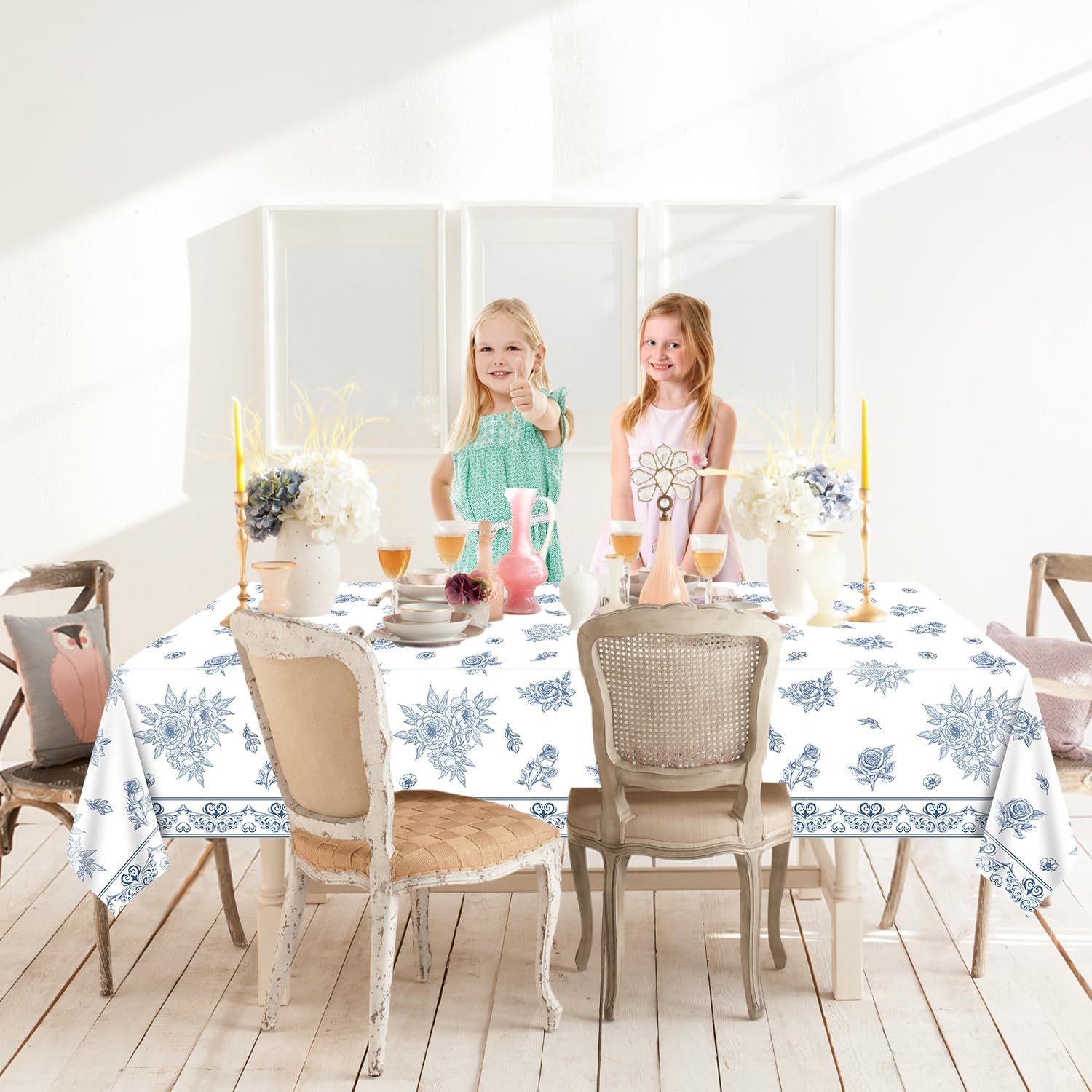 Transform your child's birthday party into a magical adventure with these flower tablecloths. Our birthday tablecloth is not only beautiful but also practical and convenient. Its perfect size 51 x 86"(130 x 220 cm) fits standard 6-foot rectangular tables. It's also lightweight and easy to use, making it suitable for both indoor and outdoor use. Whether you're planning a garden-themed bridal shower, a whimsical baby shower, or a sophisticated tea party, this set is sure to impress your guests. Get yours now and enjoy the convenience, style, and fun it brings to your birthday party! Package & Size: 4 x blue and white floral tablecloths(51 x 86.6" /130 x 220 cm)