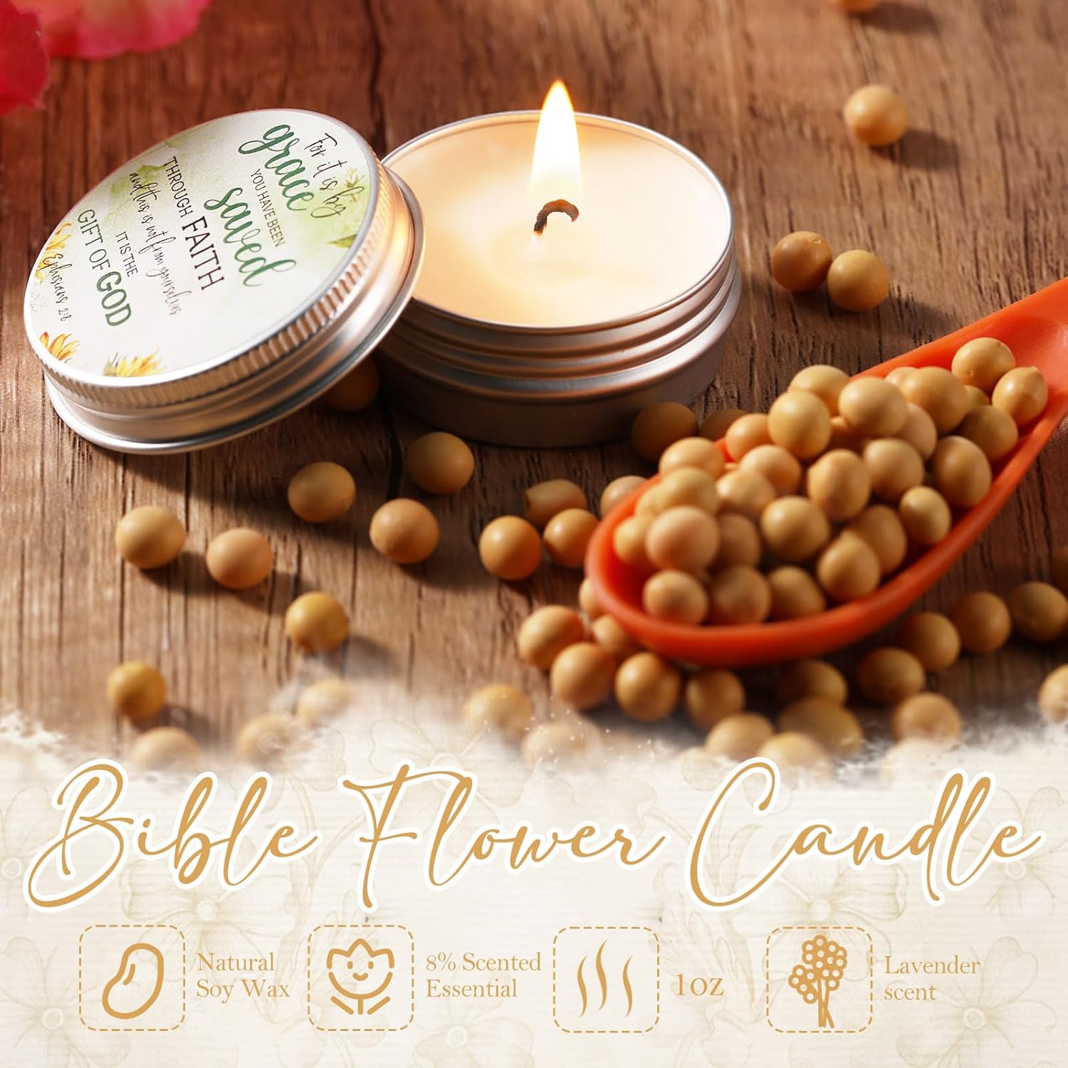 Thoughtful gift for every believerSuitable for church events, retreats, or personal devotions, this floral christian bible gift set is designed to uplift and inspire. Whether as a heartfelt gesture for a friend or a bulk gift for a congregation, these scented religious bible candle serve as a beautiful reminder of faith and love, offering comfort and hope in every flicker. Relaxing lavender scentEach candle is infused with a relaxing lavender scent that fills the space with a calming fragrance, helping to create a peaceful environment for prayer, reflection, or relaxation. Specifications: Material: tin, vegetable waxSize: 0.67 x 1.57 inch(LxW)2 X 2.8 inch(LxW)3.9 x 4.7 inch(LxW)Package includes: 48 x Candles48 x Floral verses cards 48 x White organza bagsNotes: Manual measurement, please allow slight errors on size. The color may exist a slight difference due to different screen displays.