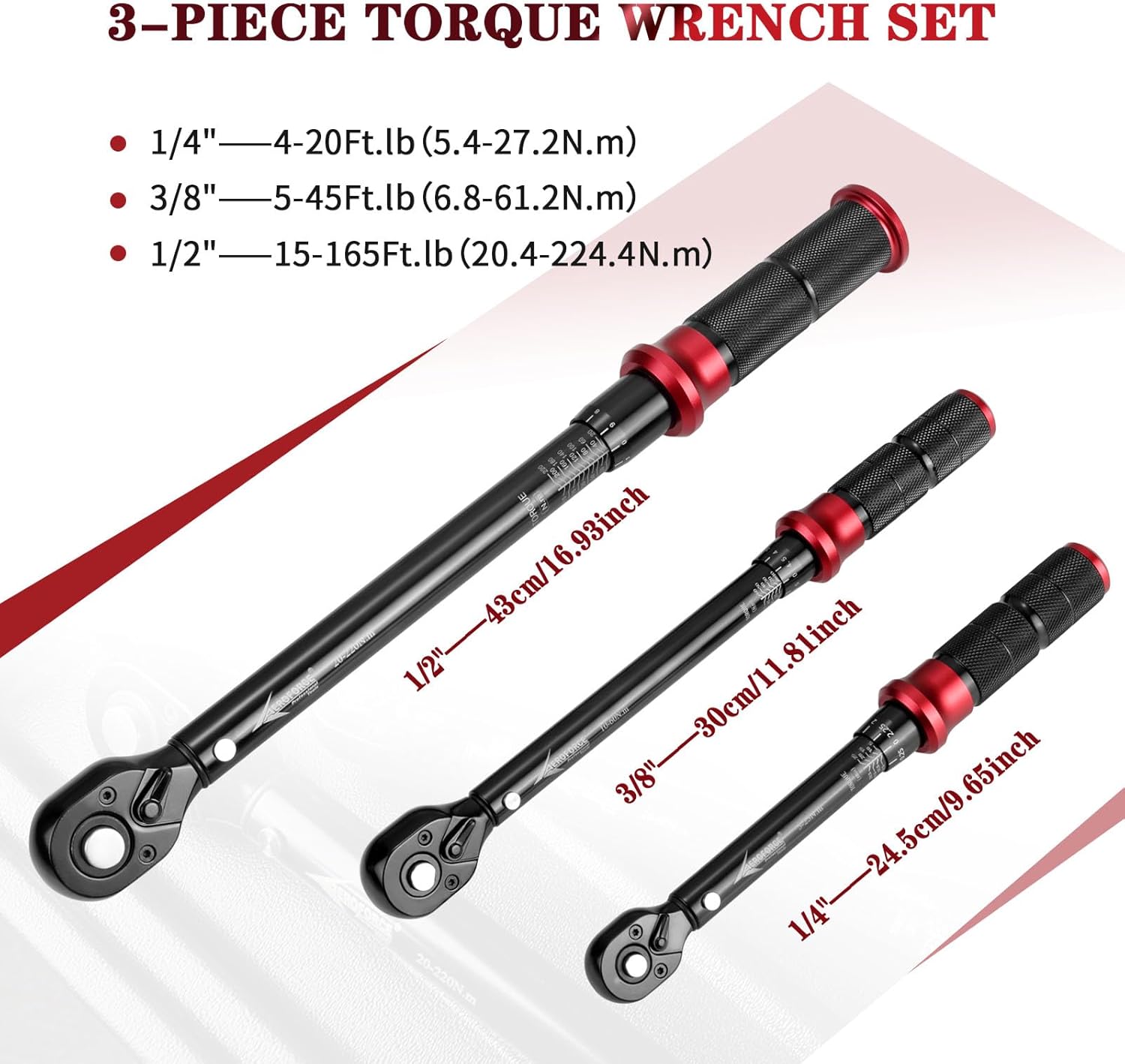 | Included Components | 1/2-inch Drive Click Torque Wrench 15-165Ft.lb x1, 1/4-inch Drive Click Torque Wrench 4-20Ft.lb x1, 3/8-inch Drive Click Torque Wrench 5-45Ft.lb x1 |