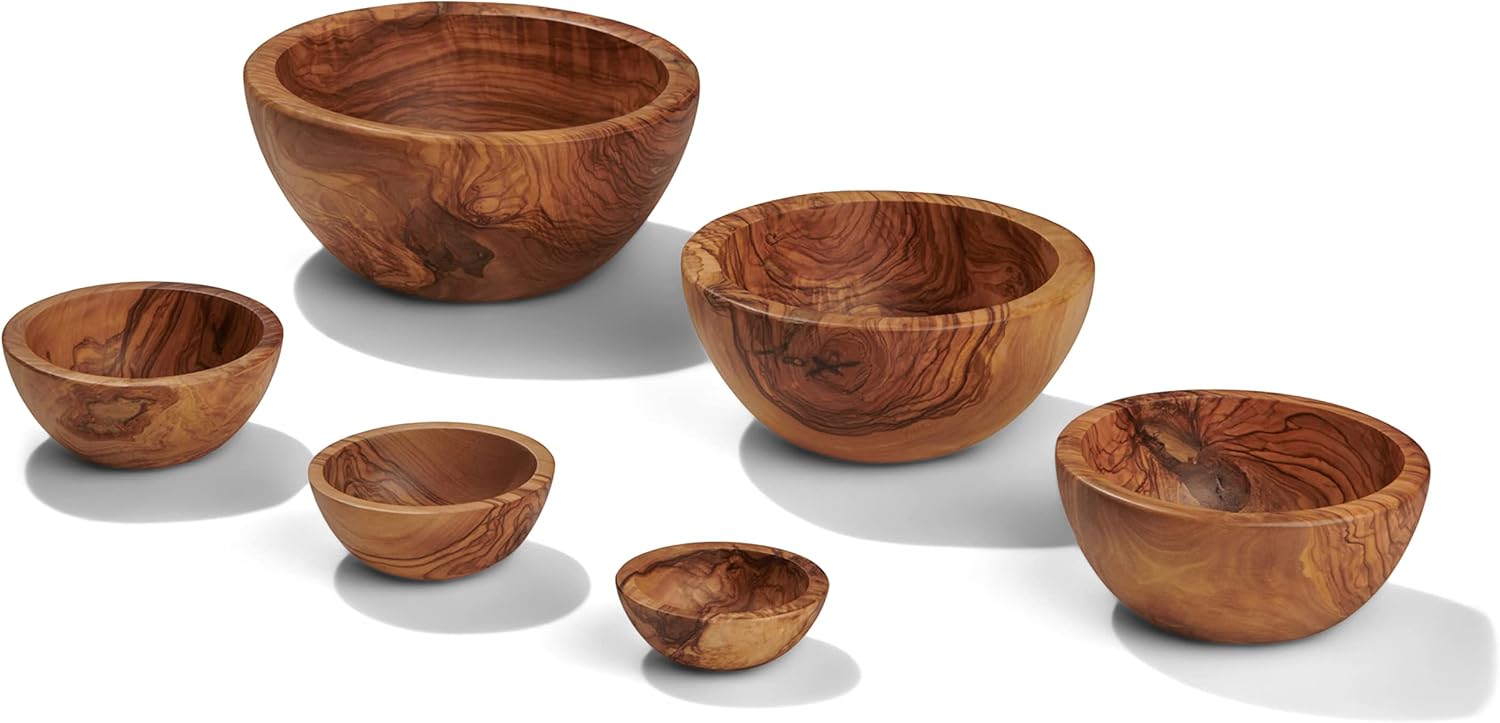 The Berard Set of 6 Olive wood bowls are handcrafted, useful and bring a decorative and elegant touch to your table. The graduated sizes make for multiple uses and have a coordinated look while each bowl is unique to the specific piece of wood used for each bowl. The bowls have the diameters of 6/8/10/12/14/16cm. Contained in a gift box, the set is a wonderful gift for a host, hostess or yourself. Located in the mountains of Provence, Berard has specialized in creating hand-crafted olive wood boards, bowls and kitchen utensils since 1892. The craftsmanship of each item is highlighted by the patterns and grain of the olive wood. The production of each piece is unique as 100% of the wood is used; nothing is discarded. The wood is harvested from older olive trees that are no longer fruit-bearing, thus creating functional art from trees that otherwise would have been destroyed.