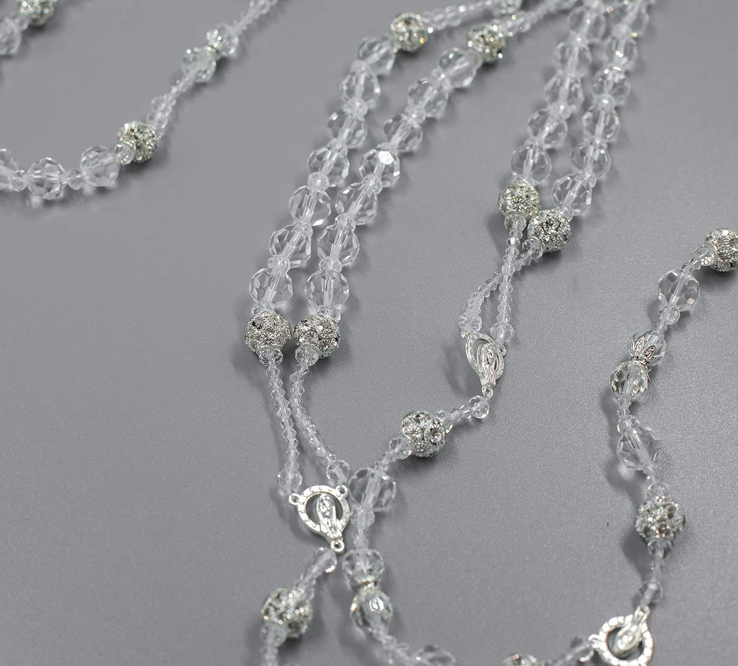 This special heirloom-quality Mexican wedding Lasso is handcrafted with 8mm crystal beads and a silver chain. The symbolism of the lasso is to show the union and protection of marriage. The rosary lasso drapes around the shoulders of the kneeling bride and groom, groom's shoulder's first. The wife's rosary lasso loop has center of a bouquet of flowers which ends up resting on her chest. The loops are symbolic of their never ending love. At the end of the ceremony, the lasso is given to the bride as a memento of her becoming the lady of the groom's heart and home and shows their promise to always be together side-by-side. The actual lasso is twisted in a figure eight, the mathematical symbol of infinity, to symbolize forever and eternity. The wedding lasso and arras are special gift for bride and groom