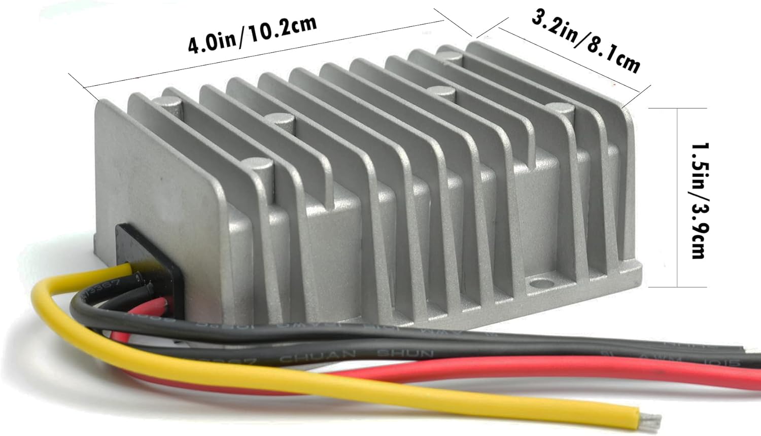 The dc converter regulator is a high reliability power transformer. It features wide input voltage, low power consumption, high efficiency, high reliability. It can work safely and reliability in 40°C~80°C. It widely used in industrial, automotive, instruments, telecommunication and civil applications. Synchronization Rectification Technology,efficiency up to 96% max Industry grade DC 60V 72V to 12V step-down converter 5 Safty Protections: Over-load, Over-current, Over-temperature, Short-circuit, Over-voltage; Auto-recovery when device is back to normal operating Die-cast aluminum shell, epoxy potting, cooling by free air convection Applications: golf cart, forklifts, bus, CMB, large trucks, motor car, solar power generating, bus displaying screen, taxi advertising screen, taxi radio without interference, car audio speaker, LCD TV, LED, intercom and monitor system, etc. Stable and reliable performance, 100% waterproof & anti-shock protection, lifetime up to 100,000 hours Ultra compact size, light weight Non-Isolated Module Easy to install Case material: die-cast aluminum Potting material: epoxy sealed Input voltage: 60V/72V DC Input range: 60-72V DC Output voltage: 12V DC Output current: 20A Output Rated Power: 240W Efficiency: 97% max Operating temperature:-40 ~ 80℃ Waterproof rating: IP68 Dimensions(WxDxH):4"x3.2"x1.5"/ 10.2x8.1x3.9cm Fixing Hole Diameter: 5mm(0.20 inch) Net weight:18.1oz/514g Package included: 1 x DC Voltage converter regulator