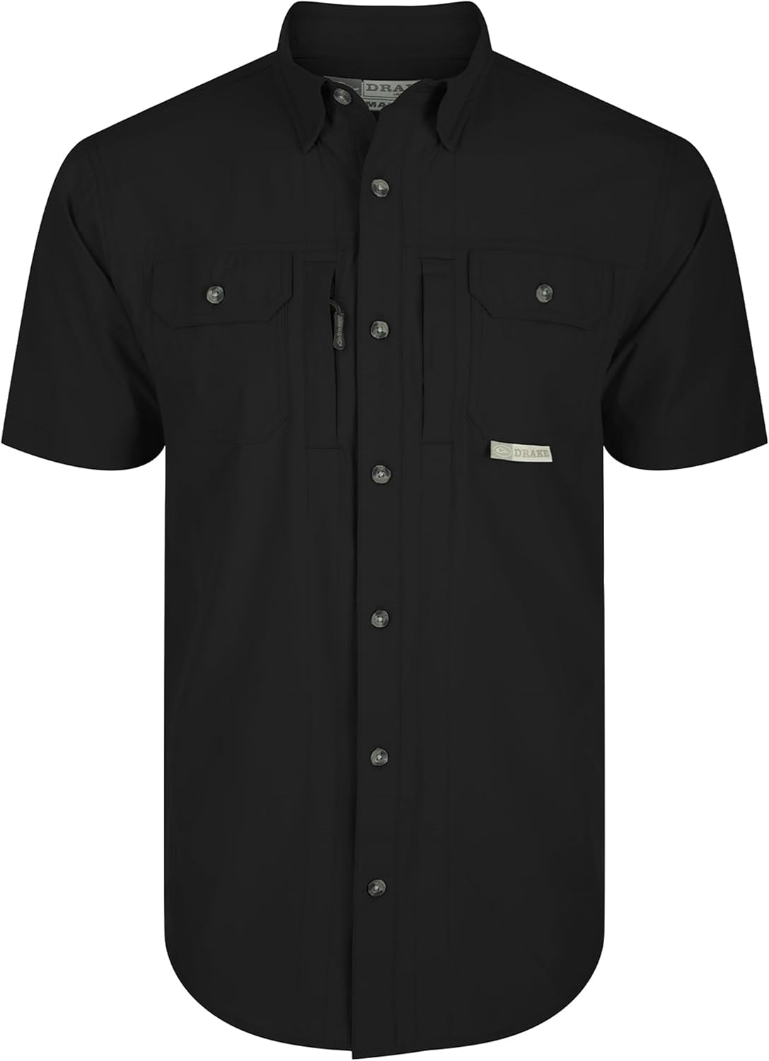 We revamped our classic Wingshooter's into the Wingshooter's Trey Short Sleeve Shirt, crafting it from a silky, lightweight 95% Polyester and 5% Spandex blend. This performance fabric wicks moisture swiftly, offers UPF30 sun protection, and provides natural stretch for ease of movement. The Trey features a classic fit, hidden button-down collar, two flap chest pockets, and vented back panels. It includes a hidden zippered pocket, Magnattach closure, sculpted hem for tucking or untucking, and a built-in sunglass wipe. We've enhanced a timeless design with advanced features, setting a new standard for Drake performance shirts.