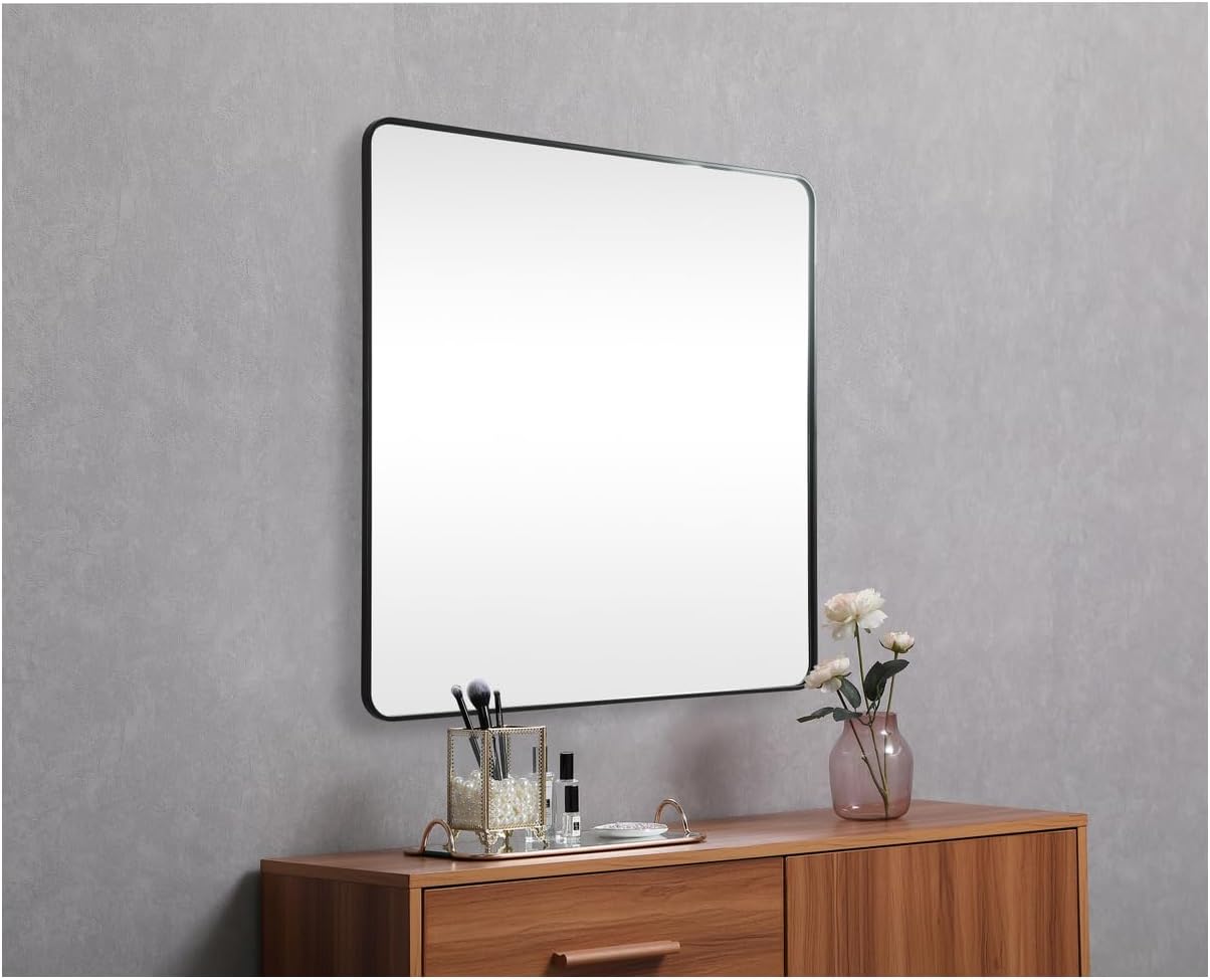 Enhance the appeal of your home or office with this modern mirror, featuring a thin rounded metal edges in a deep profile, reflecting a minimalist's design and trendy styling. To ensure your home safety, we used two hangers that are securely welded to the back of the metal frame , which sit on top of the frame for easy hanging. We recommend using suitable heavy duty picture/mirror hooks, selecting the best type of fixing for the particular wall you wish to hang the mirror on, using the appropriate rawl plug if required.Features:- Material: Metal, iron, MDF- Finish: Black- Room Use: Living room, entryway, bathroom, office- The mirror is skillfully recessed into the frame, not only enhancing its aesthetic appeal but also providing added protection against accidental damage.- The mirror boasts a solid MDF board backing, ensuring stability and longevity. You can trust that it will remain a beautiful centerpiece in your home for years to come.- Designed for indoor use, this mirror seamlessly fits into any room, whether it's your living room, bedroom, bathroom, or hallway, making it a versatile and timeless addition to your decor.- We've made installation a breeze. The mirror comes with two welded hangers at the back of the frame, allowing you to effortlessly hang it in your preferred orientation.- Its minimalist design and neutral color palette ensure it will complement any decor style, whether you prefer a contemporary, traditional, or eclectic look.- Crafted with precision, this square-shaped mirror features elegant rounded corners and a slim iron frame, adding a touch of contemporary sophistication to any room.- Keeping this mirror looking its best is a breeze. Simply wipe it down with a damp cloth to remove dust and smudges, and it will continue to shine.- Mirror hanging orientation: Horizontal- Mirror mounting/attachment type: Metal inset hanger- Mirror number of hanging brackets: 2- Mirror type: FlatSpecifications:- Product Dimensions: 48"H x 48"W x 1"D- Product Weight: 44 lbs- Mirror Dimensions: 47.2"H x 47.2"W x 0.16"D- Shape: Square- Warranty: 1 year limited