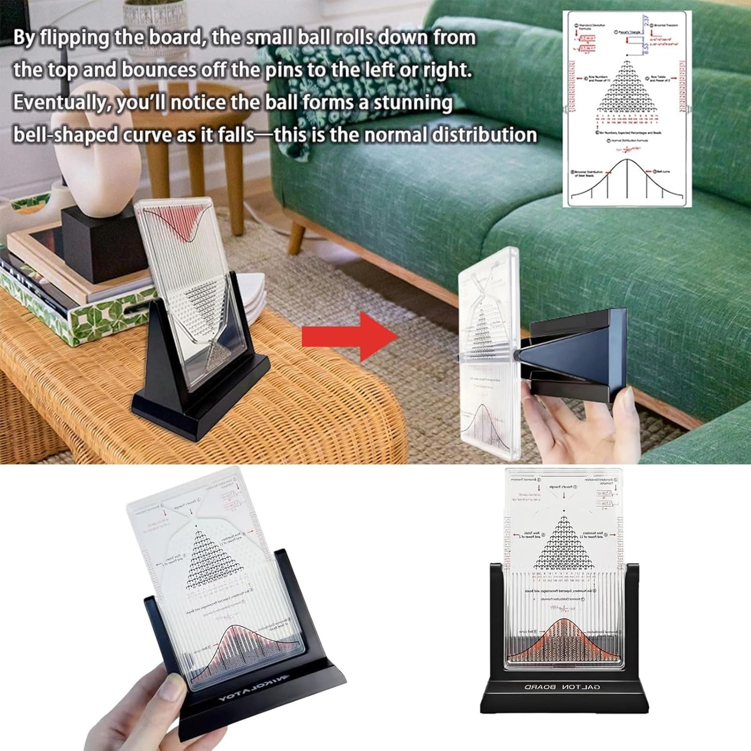 Elevate your executive workspace with this Galton Board Kinetic Art Desk Decor—a seamless blend of scientific intrigue and stress relief for modern professionals. Unlike generic desk toys, this piece turns the chaos of randomness into a mesmerizing display of order: as steel beads cascade through precision pegs to form a perfect bell curve, their gentle clinking creates a meditative sensory experience that eases workday stress and recharges focus.Whether you’re taking a break from a high-pressure meeting or hosting clients in your reception area, this kinetic art piece sparks fascinating conversations about probability and statistics—all while adding a touch of sophisticated design to your space. The 6.7-inch compact version (350g, 3000 steel beads) fits perfectly on home office desks or bookshelves, while the 12-inch premium model (600g, 17500 steel beads) makes a bold statement in executive suites or corporate lobbies.Crafted with crystal-clear acrylic and a reinforced PP frame, the board features an anti-scratch surface and rust-resistant pegs that maintain their sleek appearance for years. It requires no charging, apps, or maintenance—simply tilt the board to activate a 30-second micro-meditation session that fits seamlessly between meetings and deep-work sprints. This is more than decor; it’s a cognitive tool for professionals who value mindfulness and intellectual curiosity.What's Included?1 × Galton Board Kinetic Art Decor(6.7-inch: 12×7×17cm/4.72×2.9×6.7in, 350g, 3000 steel beads pre-loaded / 12-inch: 23×11×30.5cm/9×4.3×12in, 600g, 17500 steel beads pre-loaded)1 × Product Instruction Manual (English)Customer Support:If you have any questions about our products, please feel free to contact us. We are committed to resolving your issues quickly and guarantee a response within 24 hours. Your satisfaction is our top priority.