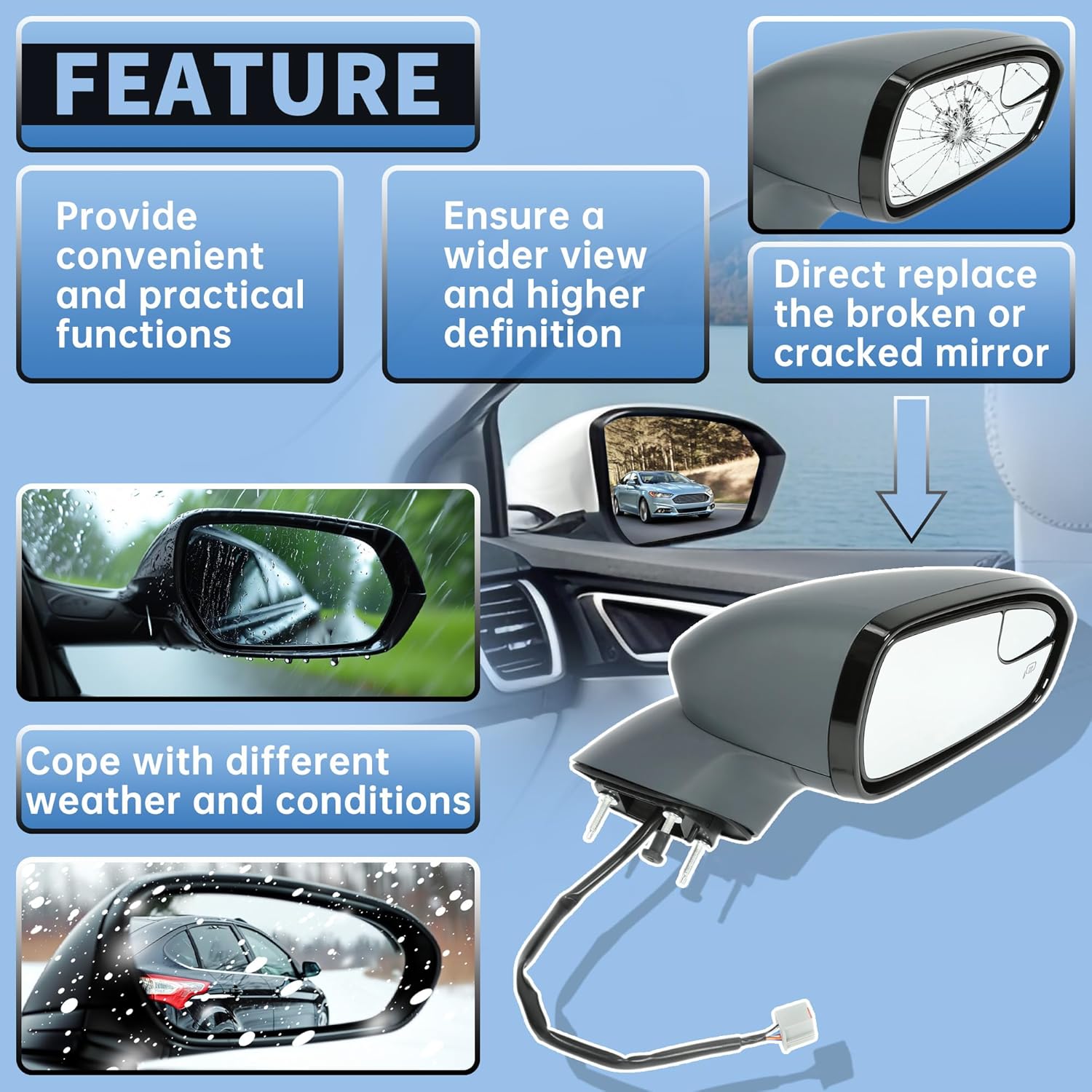 • Function - Direct replace the broken or cracked mirror, restore the proper function of the mirror and the appearance of your car. Re-provide excellent vision for your driving, improve driving safety.