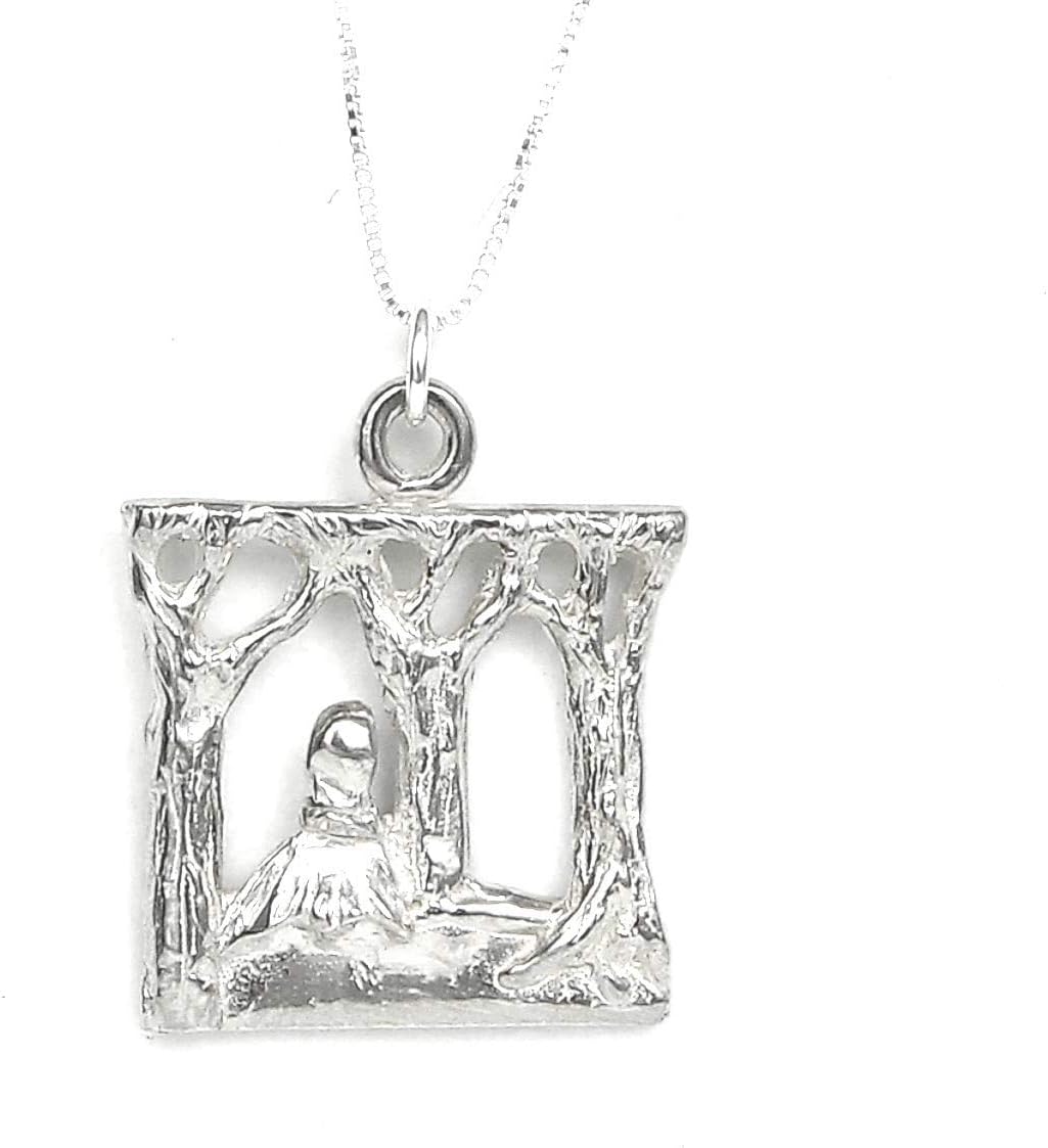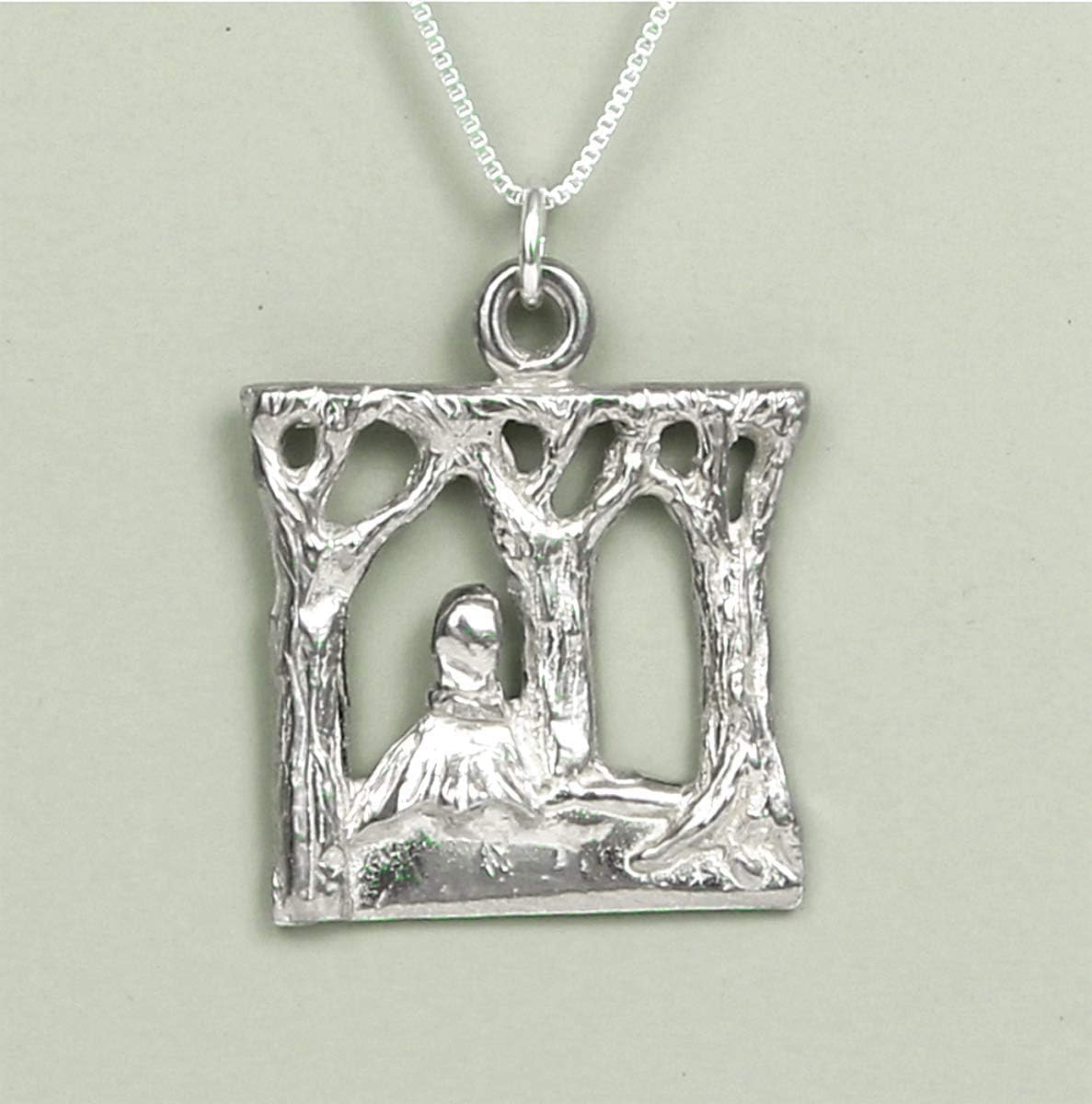 Into The Woods inspired Necklace shows a figure in a hooded cape wandering into the woods. Hand cast in Sterling Silver. Gift Packaged with necklace chain, story card with artist bio and branded gift box. Made in America. Great Gift for Cast, Crew, Production Staff or Fans of Into The Woods, Musical Theater or Little Red Riding Hood Please see photo with ruler for scale and size. Pendant is approximately .9" tall (not including top ring) and .9" wide. Sterling Silver and Manufactured in USA. Chain is Sterling Silver box style with spring ring clasp and 20" in length. Included Story Card reads: Wish, Wish Wish.... and Into The Woods we'll Go - Handcrafted Sterling Silver Included Artist Bio reads: Nature inspired whimsy begins as a wax sculpture by artist, Lori Strickland. Designs are reproduced in sterling silver by the traditional lost wax casting method. Made in Florida. Jewelry should not be worn in shower or while swimming. Please clean carefully with a jewelry cloth.