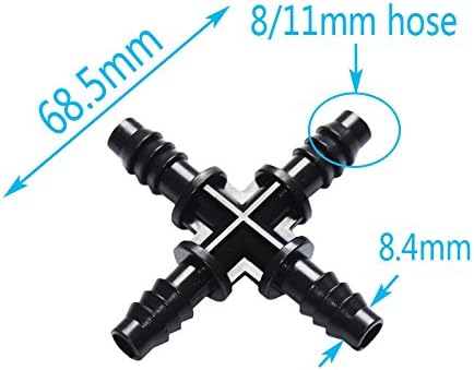 Cross water splitter Cross barb water irrigation connector water splitter fitting 8/11 irrigation connector barbed well Cross-connector, widely used in garden plant irrigation, sprinkler, safe material, easy to use long life, good product quality. Suitable for 8 / 11mm hose. Packing: 30pcs Product size imageï¼ window.adminAccountId=228463653.Item specifics:Type: Garden Water ConnectorsStandard: BSGarden water connector type: Hose SplittersMaterial: PLASTICModel number: 8/11mmPlastic type: ABSName: Cross ConnectorSpecifications: See pictureType: cross CrossRange: hose splitterCategory: Water connectorAdvantages: Quick connectorApplies to: 8/11 HoseColour: BlackPacking: 30pcsWeight: 252g