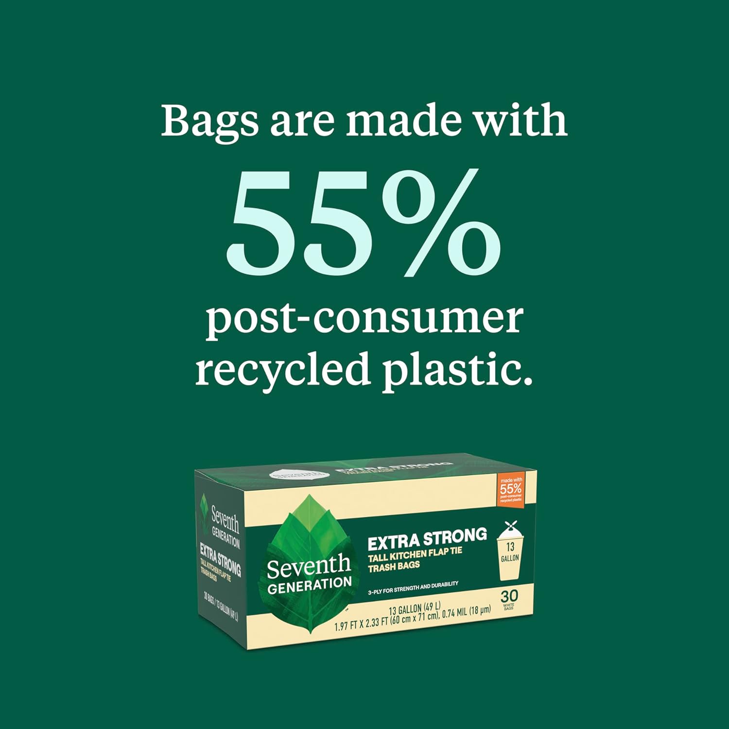 Seventh Generation Tall Kitchen Trash Bags are the sustainable and durable choice for your kitchen waste. Our trash bags are made with 55% recycled content making these trash bags a more sustainable choice than trash bags made from 100% virgin plastic. Each bag features our Gencore 3-layer technology making them tough and flexible maximizing your ability to fill each bag. These trash bags feature a convenient flap tie closure making clean-up easy! At Seventh Generation we do business differently. We believe our products are healthy solutions for use within your home–and for the community and environment outside of it. We are always evaluating how to reduce their environmental impact, increase performance and safety, and create a more sustainable supply chain. We believe it is our responsibility to set a course for a more mindful way of doing business, where companies act as partners with other stakeholders to create a brighter future for the whole planet. Seventh Generation is proud to be a Certified B Corporation. B Corps are certified to be better for workers, better for communities, and better for the environment. By choosing Seventh Generation products, you’re joining us in nurturing the health of the next seven generations.