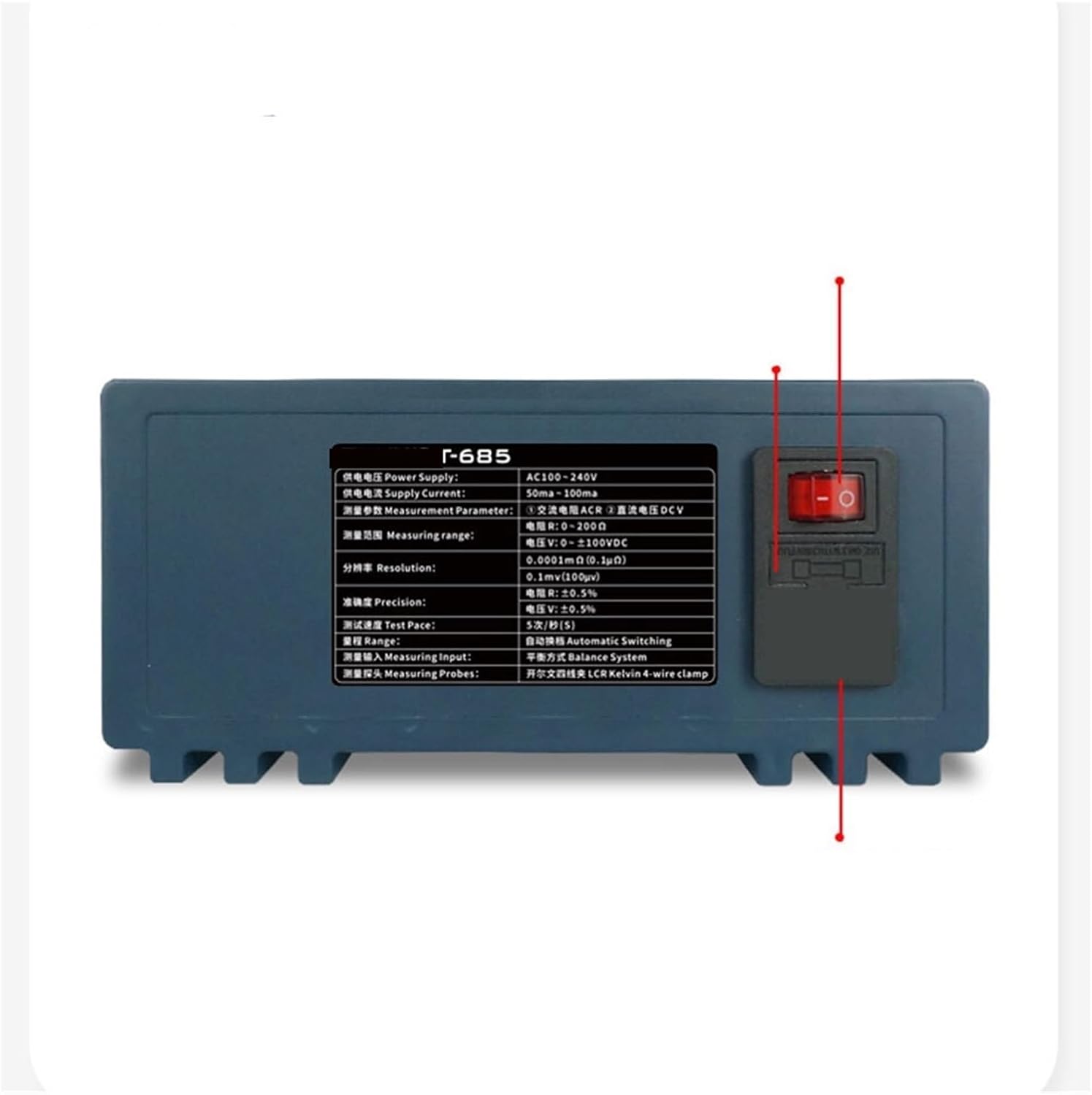 Supply current range 50ma to 100maRange automatic shiftMeasurement input balance modeMeasuring Probe Kelvin Four-Wire ClampLanguage can be switched between Chinese and EnglishUSB port connected to computer to readThe size is 190*180*80mmDisplay Dual 5-digit 2.4-inch LCD with bright backlightAccuracy: Resistance: +0.5%