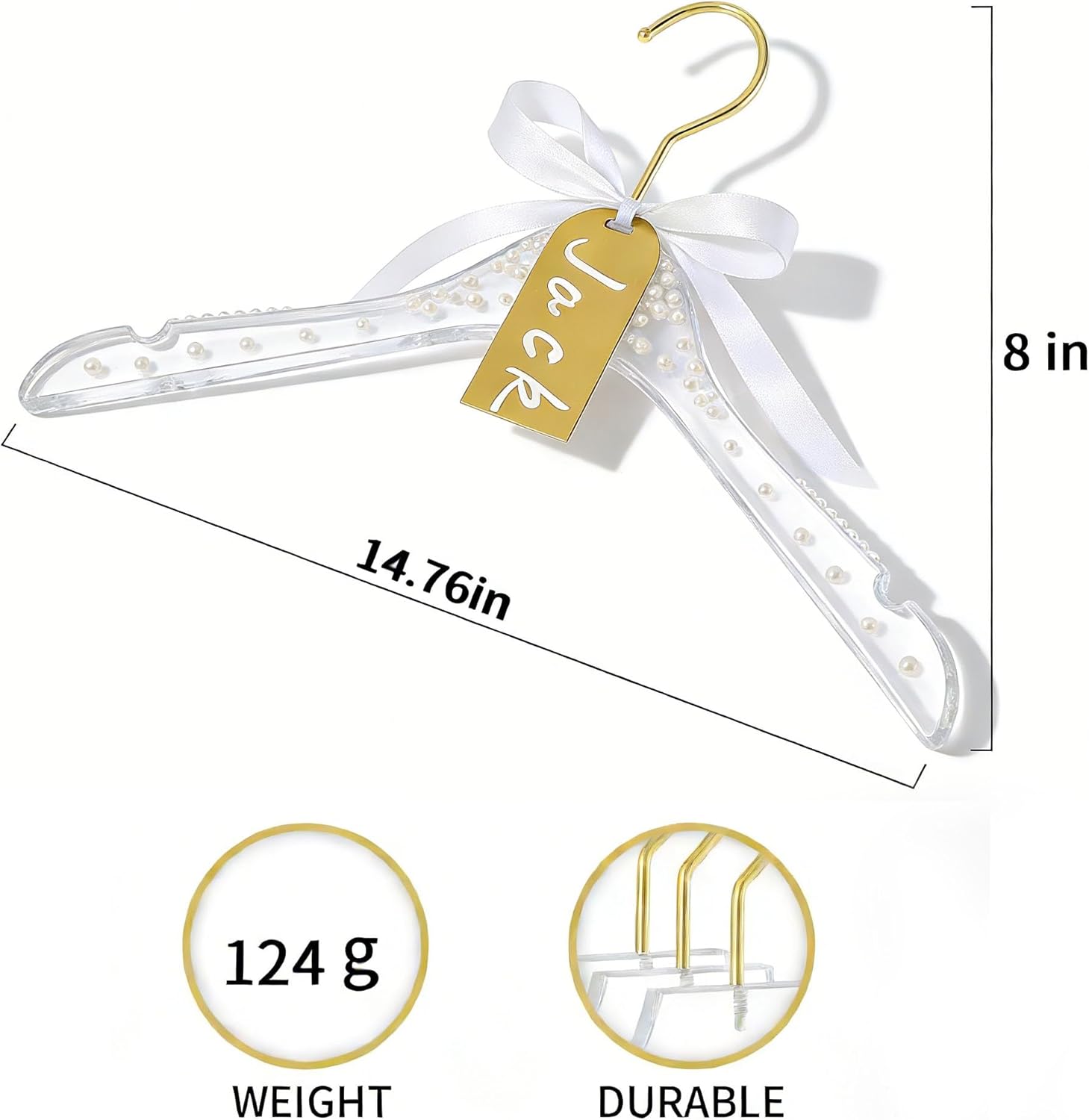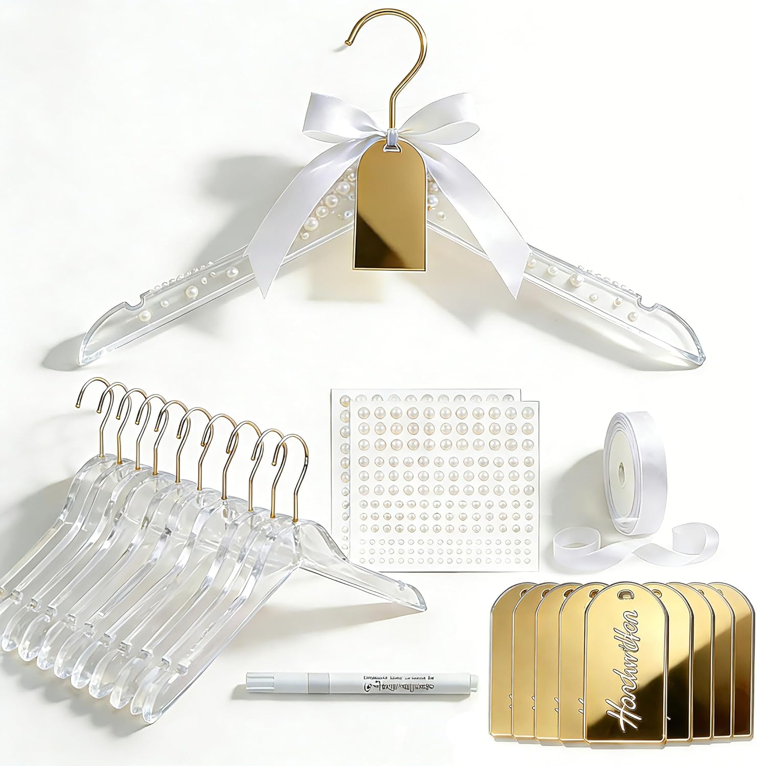 ✨ Elevate Your Wedding Details with Thoughtful, Personalized Touches Planning a wedding means caring about every small, meaningful moment. Our 10-pack clear acrylic wedding hangers are designed to turn ordinary dress storage into memorable, photo-ready decor for your big day. ✅ All-In-One Complete DIY Kit Each set includes 10 clear acrylic hangers, 10 custom name tags, ribbon, pearl stickers, and a marker. Everything you need to create 10 finished, personalized hangers—no extra supplies required. ✅ Fully Customizable for Your Wedding Story Write names, roles, wedding dates or sweet messages on the included tags. Decorate with ribbon and pearl stickers to match your theme. Each hanger can be unique, making it perfect for brides, bridesmaids, and wedding party keepsakes. ✅ Sturdy Clear Acrylic Construction Made of quality transparent acrylic, these hangers offer a sleek, elegant look and reliable structure for wedding gowns, bridesmaid dresses, and formal attire. Ideal for both display and daily pre-wedding use. ✅ Versatile for Wedding Scenes Use for bridal photoshoots, dress display in the getting-ready room, meaningful bridesmaid gifts, engagement and bachelorette decorations. A practical and heartfelt addition to your wedding preparation essentials. Add these DIY wedding hangers to your cart and craft one-of-a-kind pieces that complement your special day.