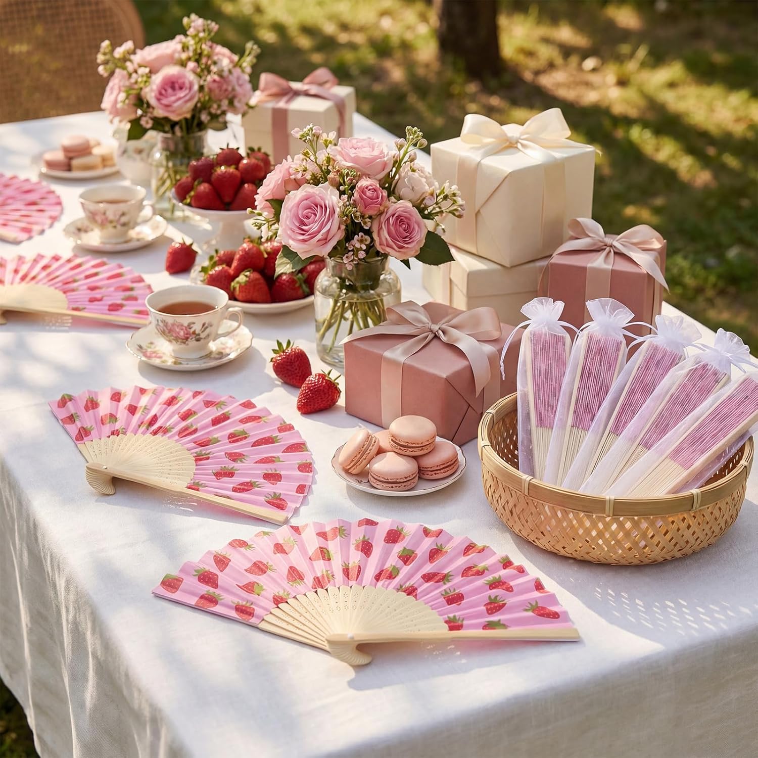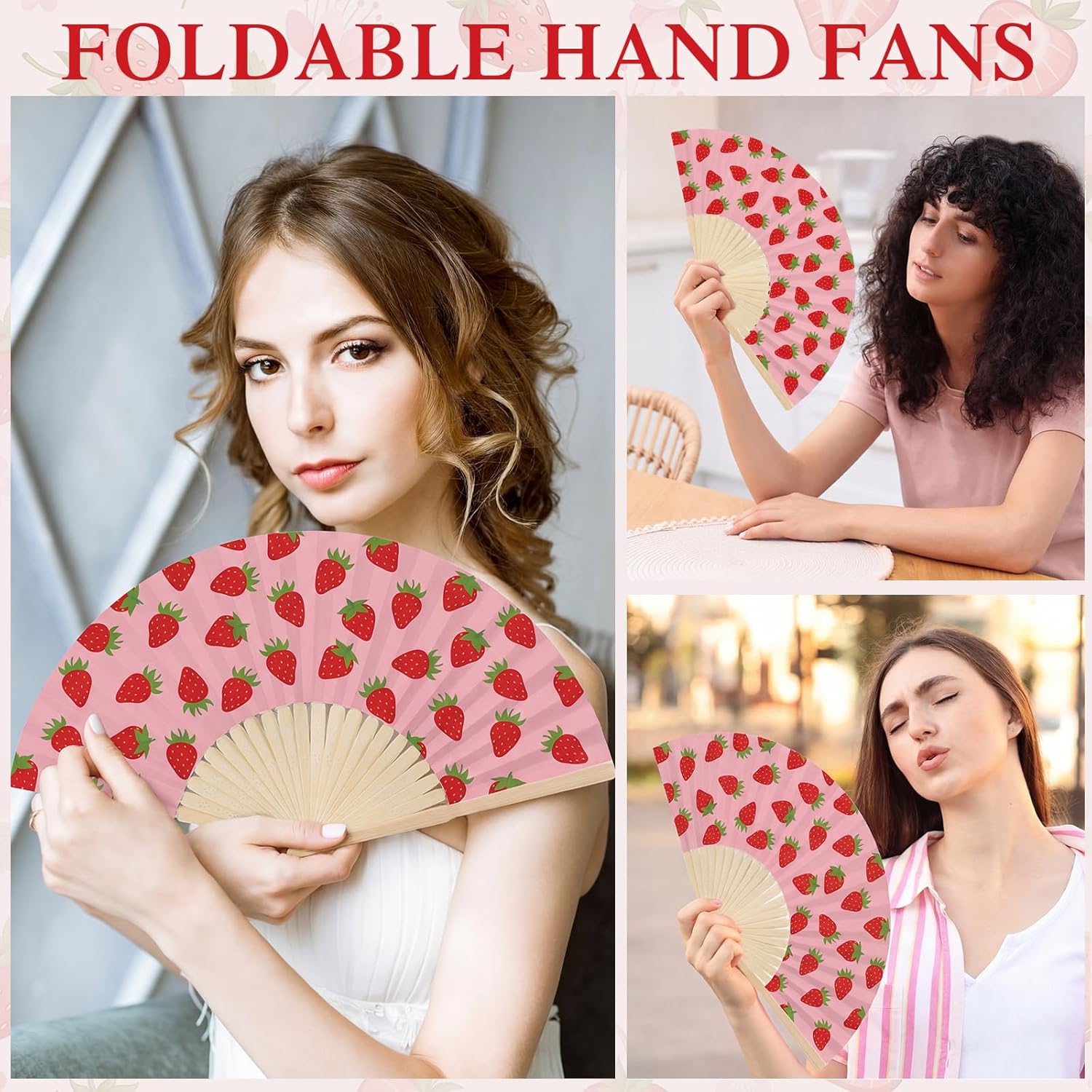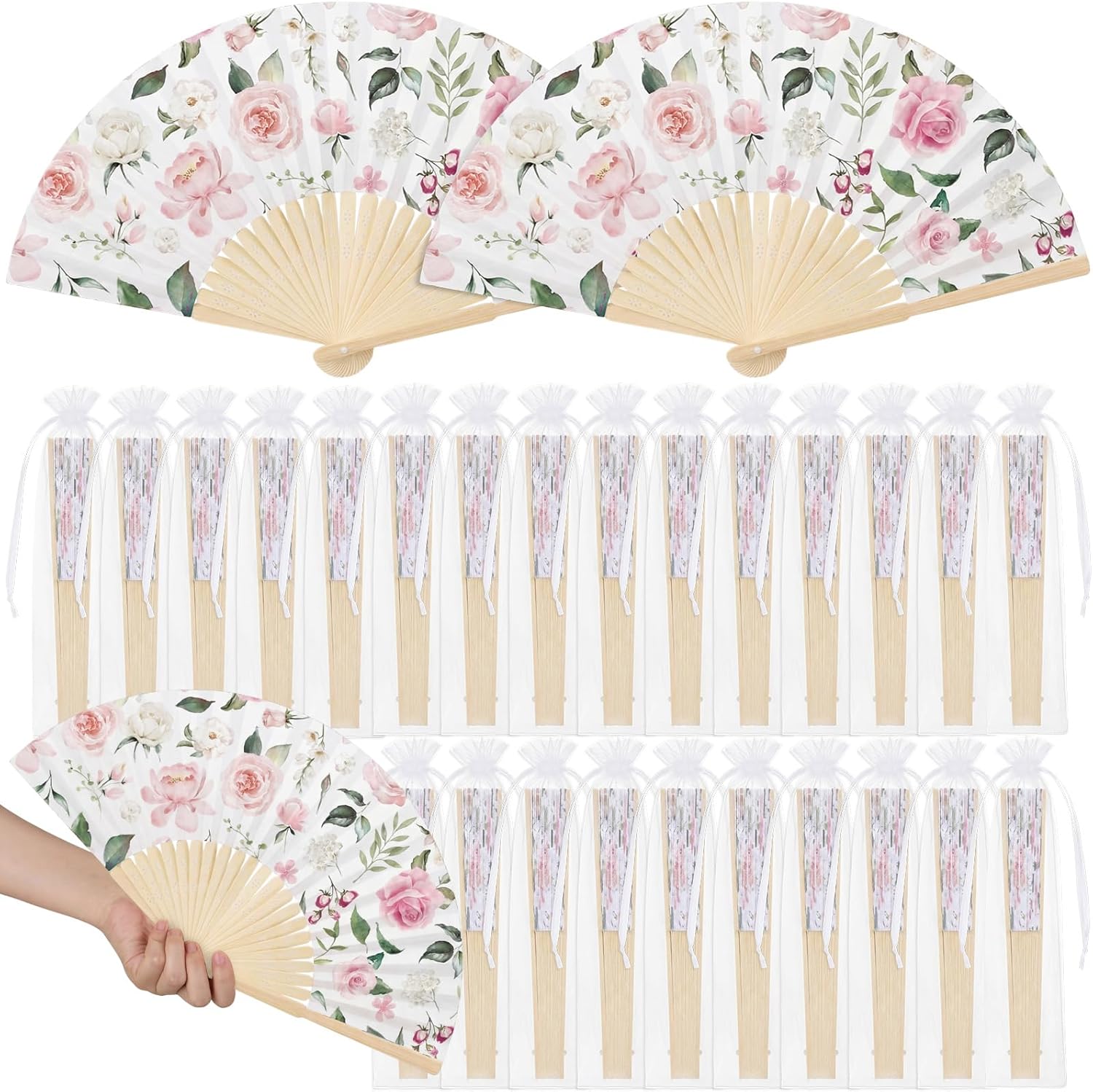Features: Featuring the cute pink strawberry pattern on durable bamboo and paper, these folding fans are ideal for cooling guests and adding charm as wedding, bridal shower, baby shower or garden party favors. Each fan unfolds to 15 x 8.3 inches for comfortable use and folds compactly for easy carrying. Ideal as bridal fans, decorative props, photo accessories, or functional favors, this set combines style and practicality for events ranging from baby shower to themed parties. Specifications: Material: bamboo, paper Color: pink, red Size: Folding hand fans: about 15 x 8.3 inches/ 38 x 21 cm unfolded Organza bags: 10.2 x 2.4 inches/ 26 x 6 cm Package includes: 25 x Folding hand fans 25 x Organza bags Notes: Manual measurement, please allow slight errors on size. The color may exist a slight difference due to different screen displays