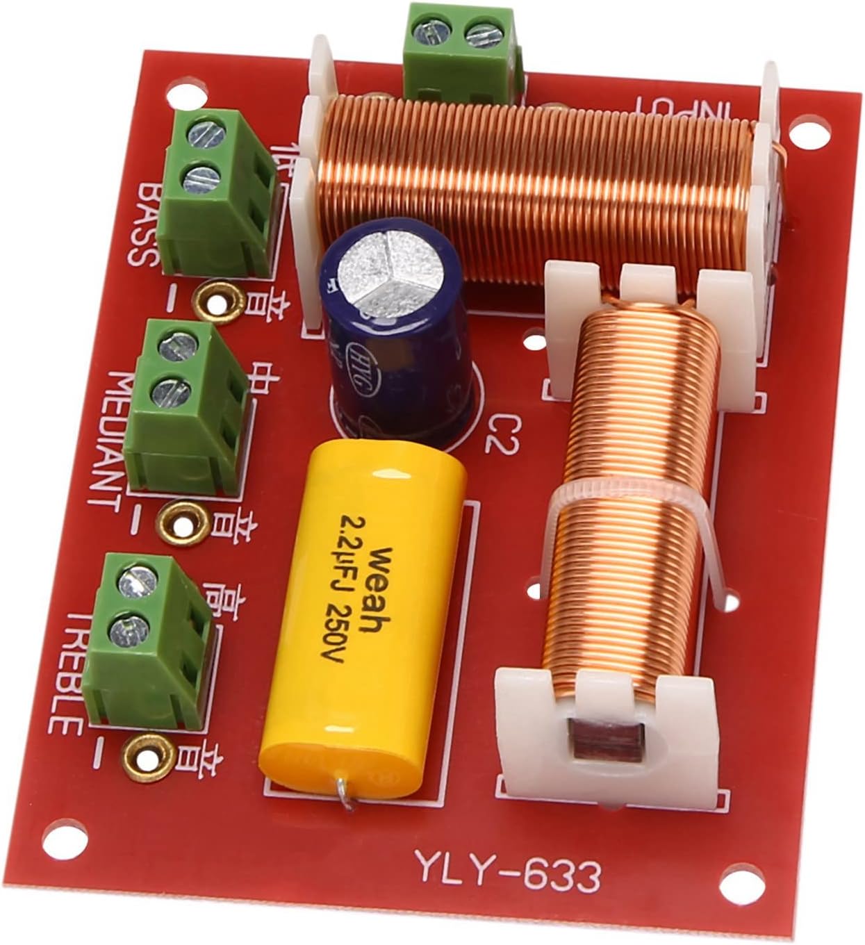 Viodmss Product parameters:Frequency point: 1000HZ / 7000HZ (that is, the works at frequencies below 1000HZ, the mid-range works between 1000HZ and 7000HZ, and the treble works above 7000HZ).Power: 200W.Impedance: 4-8 Ohm.Circuit: Determined by Debugging from 6db / oct to 12db / oct.colour: redMaterial: PCBPackage Contents:6 x Audio Speaker CrossoverOnly the above package content, other products are not included.Note: Light reflection and different displays may cause the color of the item in the picture a little different from the real thing. The measurement allowed error is +/- 1-3cm.