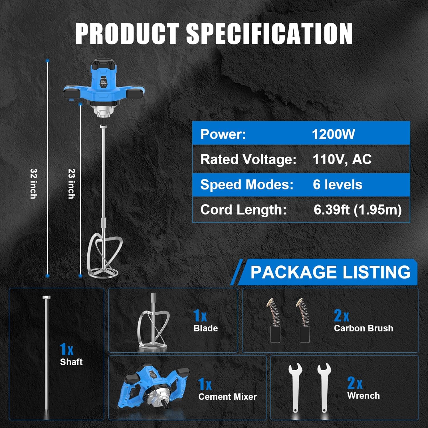 Cement Mixer Features: Die cast aluminum body - Durable die cast aluminum body is impact resistant and is designed for heavy use. Smooth ventilation system - The heat radiation system on the top to improve the air environment during working and prevent dust from going inside. When working for a long time,press the lock switch for continuous operation,you don't need to hold down the trigger while mixing,so as to reduce the working strength and fatigue of fingers Specification: Power: 1200W Stirring rod diameter: 0.55"/14mm Maximum connecting shaft diameter: 0.63"/16mm Package includes: 1X Electric Concrete Mixer 2X Wrenches 1X Stirring Rod 1X User Manual 1X S Type Agitator Head
