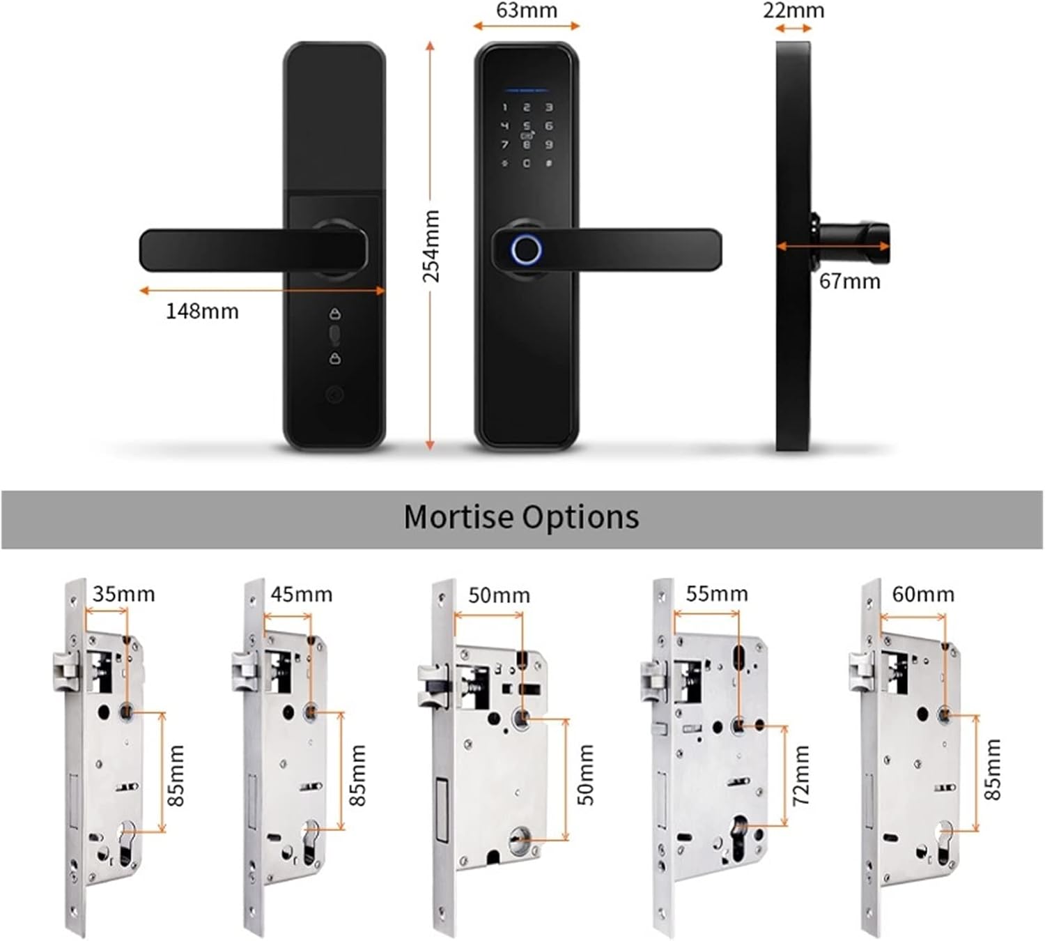 Biometric smart door locks are a security measure that every home needs. When you get home, say goodbye to the frantic search for the keys. Thanks to the smart features of the app, you are free to choose how to protect your home. The sense of security that comes with using it will definitely enhance your sense of security.In ordinary households, guests, workers and relatives are the few who are entitled to visitor privileges. If you have a busy schedule, it can be difficult to keep up with expected people. Making it harder is the need to be physically present to give them room to do business. Smart door locks let you choose who gets into your home and keep track of how long they're home. With just a smartphone app, you can keep a complete record of what's happening in your home.Material: aluminum alloySmart home not only makes life easier, but also makes life betterYour home's security level is enhanced with AES 256 encryption. It's also not a problem to figure out if you're being watched. With the virtual password feature, you can enter a fake password before and after the real password, which can be entered in garbled characters.If you live with kids, biometric smart door locks can help make your job easier. A stable log of in and out lets you know when they're home, if they're out, and with whom. Also, with parental controls, your child can use the app to open and close the door at your request.Features:1. Access via wifi App, M1 card, fingerprint, password, wristband or key2. Compatible with all kinds of mortise, fit 99% of doors.Single lock 60/70, European 5050/ 6050/ 3585/ 4585/ 6085/ 6072/ 55723. and stylish thin panel, 255*65mm, suitable for most wooden doors and sliding doors.4. One-touch biometric fingerprint sensor on the reader.Once you place your finger on the fingerprint scanner, the fingerprint scanner will automatically wake up and be conveniently positioned to match your natural hand positi