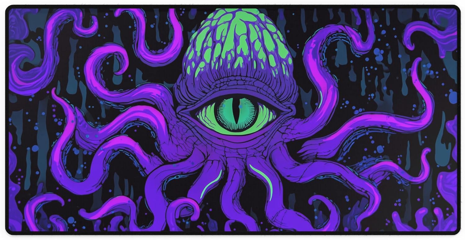 Dive deep into madness—in style. This psychedelic TCG playmat features a surreal neon vision of the Eye of Cthulhu, wrapped in swirling purple tentacles and glowing pastel energy. Perfect for those who love a little cosmic chaos with their card games, this vibrant design is dripping with personality and dark whimsy. Whether you're summoning ancient power or just flexing table flair, this mat brings maximum weird in the best way possible.