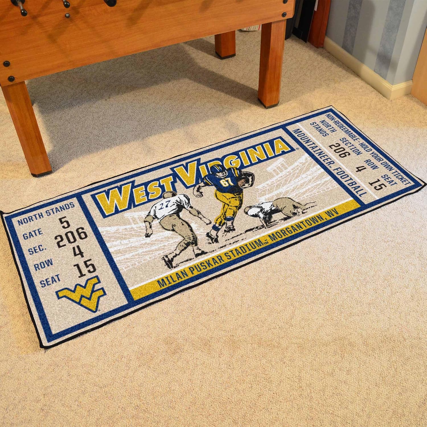 Are you a die-hard NFL fan? Then you need your favorite team's game ticket runner! This is the perfect way to show your loyalty, while adding style to your home. Made in the U.S.A. With 100% nylon carpet and non-skid recycled vinyl backing. Officially licensed and chromojet printed in true team colors.