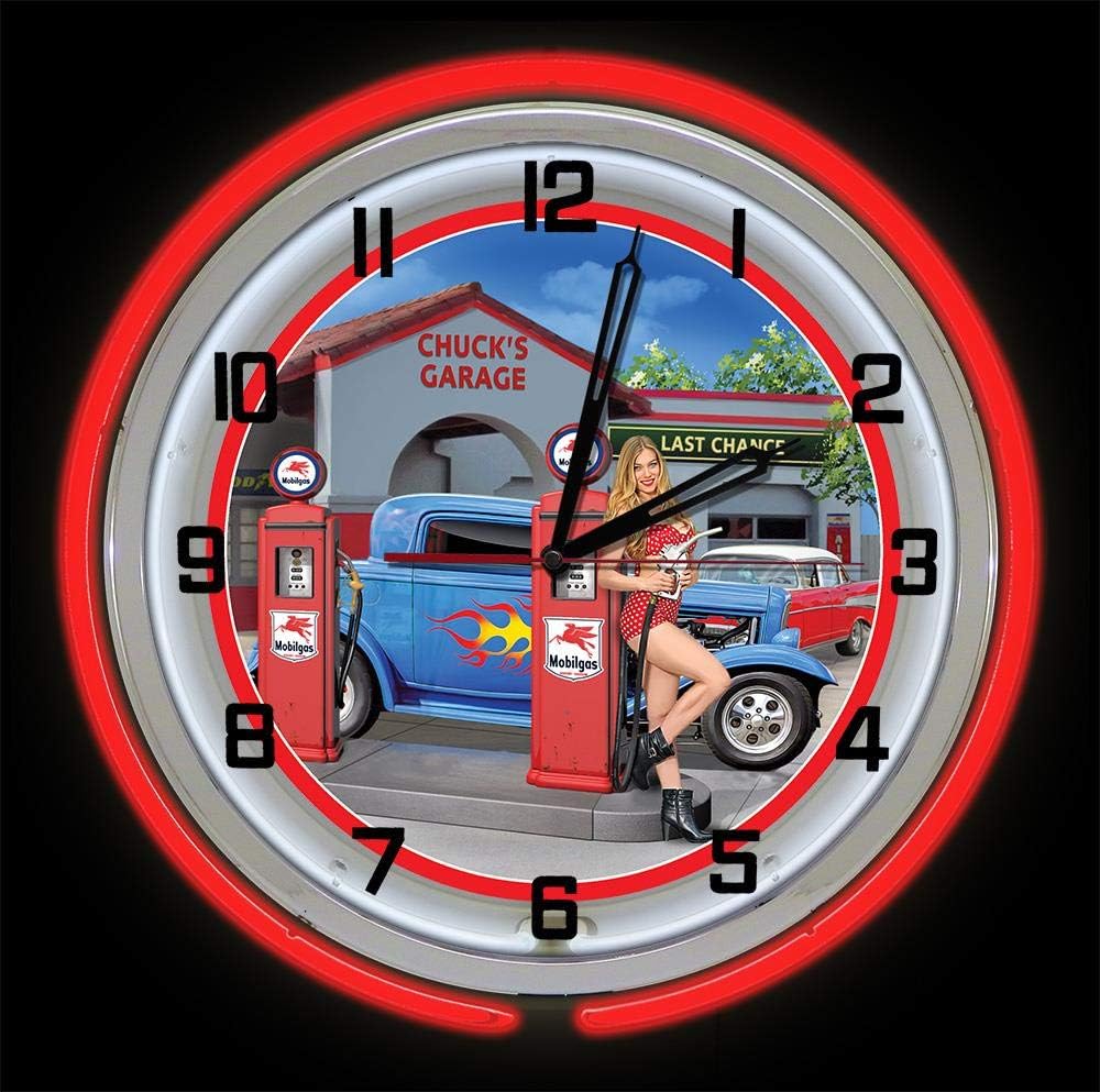 This brand new ready-to-hang neon clock makes a perfect addition to any garage, bar, game room or man cave! Clocks are lit with two double neon tubes, one color for the outside and one bright white on the inside. Clock motor contains a high-precision quartz movement and sweep technology making it smooth and quiet with no "tick-tock" noise. Inside image is a printed high quality graphic which can have words added to it upon request. Have an image or business logo you'd like to add to the clock? We can do customizing upon request. Whether you want a gift with a "wow factor" or compliment your own home/shop, our neon clocks will impress!
