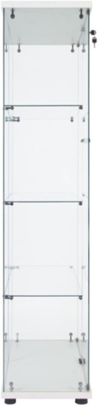The glass display case is made of thick and tough tempered glass and solid wood particle board, the size is 64''(H) x 31''(L) x 14.5''(W) inches, each piece of tempered glass is 4mm thick, safe, durable and protective, each glass shelf has a maximum load capacity of 7.7 pounds, and the adjustable feet can withstand up to 220 pounds.