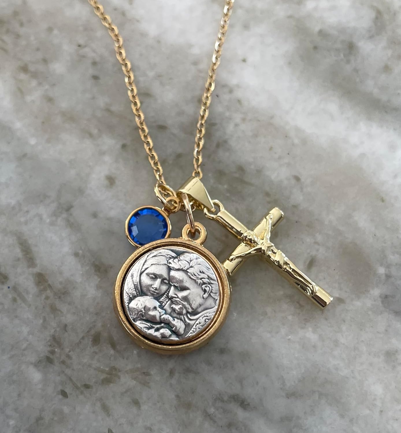 Honor faith and family with this Holy Family & Crucifix Necklace. Handcrafted with devotion, the centerpiece is a 16mm double-sided Italian medal—the Holy Family on one side and the Holy Spirit on the other—symbolizing love, protection, and divine guidance. The necklace also features a gold-filled crucifix charm and a personalized 6mm birthstone, making each piece unique. A gold stainless steel chain (available in your choice of 16, 18, or 20 inches) ensures durability, elegance, and tarnish resistance. Whether worn daily or given as a meaningful gift, this Catholic necklace is a cherished symbol of faith and devotion. Perfect for Confirmation, Baptism, First Communion, birthdays, or spiritual milestones.