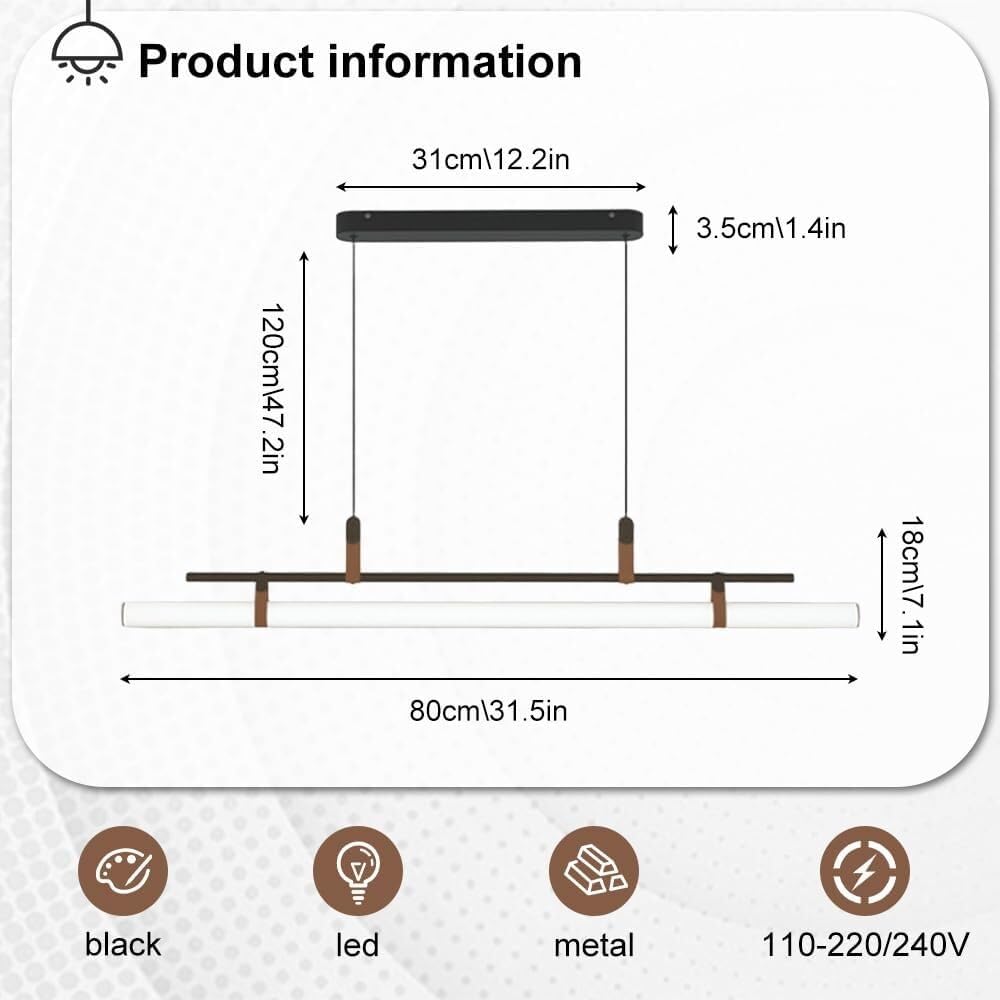 If you are seeking a lighting solution that merges contemporary design with functional illumination for your home, this linear pendant light is an excellent selection. It provides focused and ambient lighting for your areas, elevating both utility. Beyond its lighting capabilities, it serves as a sophisticated and visually appealing addition to your interior.Product Name: Modern Black/Gold Linear Pendant Light / Contemporary Dining Room Chandelier / Adjustable Island Lighting FixtureStyle: Modern, Contemporary, Minimalist, Industrial, ChicType: Pendant LightMaterial: Metal (Black or Gold finish), Leather AccentsShade Material: Diffused White AcrylicColor: Black or Gold (Metal Frame), Brown (Leather Accents), White (Light Tube)Size (Black/Gold Long Version):Canopy Length: 20.1 inches (51cm)Canopy Height: 1.4 inches (3.5cm)Total Hanging Height: 47.2 inches (120cm) (Adjustable)Fixture Total Length: 45.3 inches (115cm)Fixture Height (from main bar to tube bottom): 7.1 inches (18cm)Size (Black/Gold Short Version):Canopy Length: 12.2 inches (31cm)Canopy Height: 1.4 inches (3.5cm)Total Hanging Height: 47.2 inches (120cm) (Adjustable)Fixture Total Length: 31.5 inches (80cm)Fixture Height (from main bar to tube bottom): 7.1 inches (18cm)Indoor/Outdoor use: IndoorLighting space: Ideal for dining rooms, kitchen islands, offices, living rooms, studios, or commercial spaces.Voltage: 110/220V- 240VNumber of Light Sources: 1 (linear light tube)Applicable places: Dining Room, Kitchen Island, Office, Living Room, Study, Bar Area, Conference Room, Restaurant.Included components:1 x Linear Pendant Light Fixture1 x Installation Accessories Kit