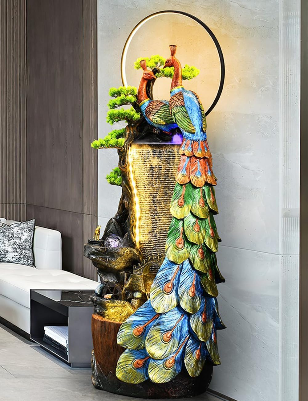 Add a Touch of Elegance and Nature to Your Space Enhance your home, garden, or office with the captivating beauty of this Peacock-Themed Water Fountain. Featuring a stunning design with intricately detailed peacocks, lush bonsai accents, and cascading water, this fountain brings a sense of serenity and sophistication to any environment. The integrated LED lights illuminate the water flow, creating a peaceful, glowing ambiance that will transform your space into a tranquil retreat.