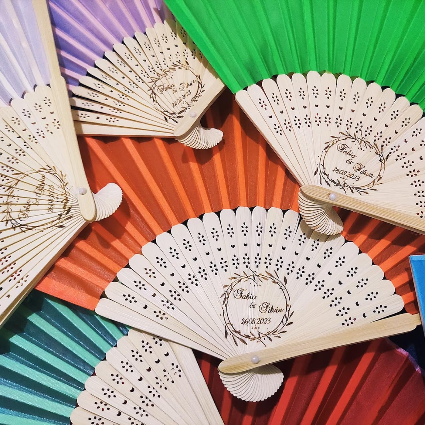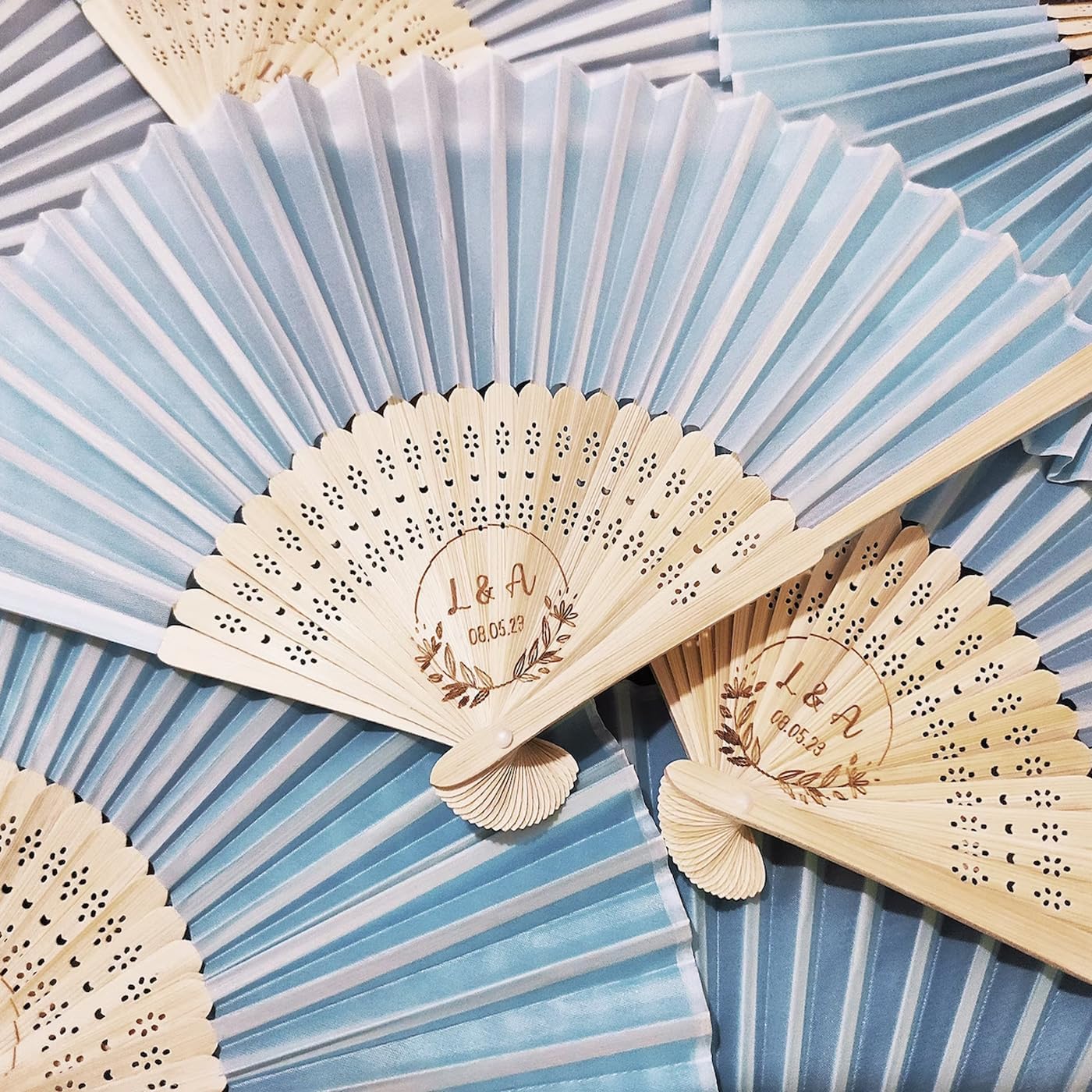 Material size: length 20.5cm, width 33cm Packing: 20pcs/30pcs/40pcs/50pcs/60pcs/100pcs in white organza bags. We can also engrave names and dates or your LOGO Material: bamboo and silk Your wedding is a reflection of your unique love story, and what better way to show that than with personalized wedding favors? These silk wedding fans can be engraved with your name, wedding date, or a special message to add a heartfelt touch to your celebration. These foldable silk hand fans are perfect for any party. Whether it's a wedding, bridal shower or thoughtful party favor, they're designed for everyday use. Each fan features a unique design that adds elegance to your overall look. Compact and portable after folding, it can be easily put into your pocket and convenient to carry around. Always look cool. Wide application: Silk folding fans are suitable for home, office, teahouse and stage, and can also be used as gifts for family or friends, and can also be used as party favors for weddings, birthdays, baby showers, bridal showers, graduations or any occasion outdoors Or an indoor event, add a chic vibe to your party that your guests will love.