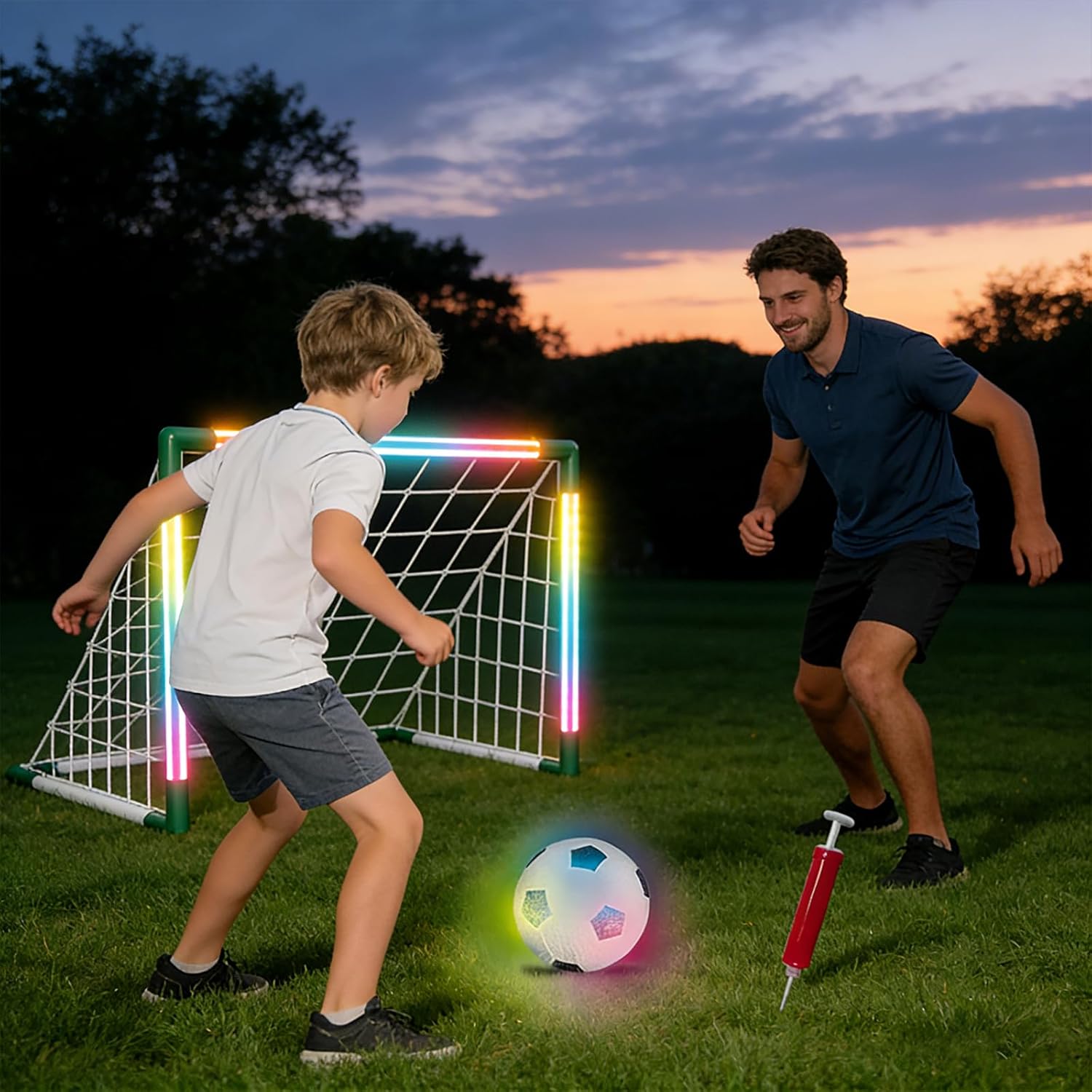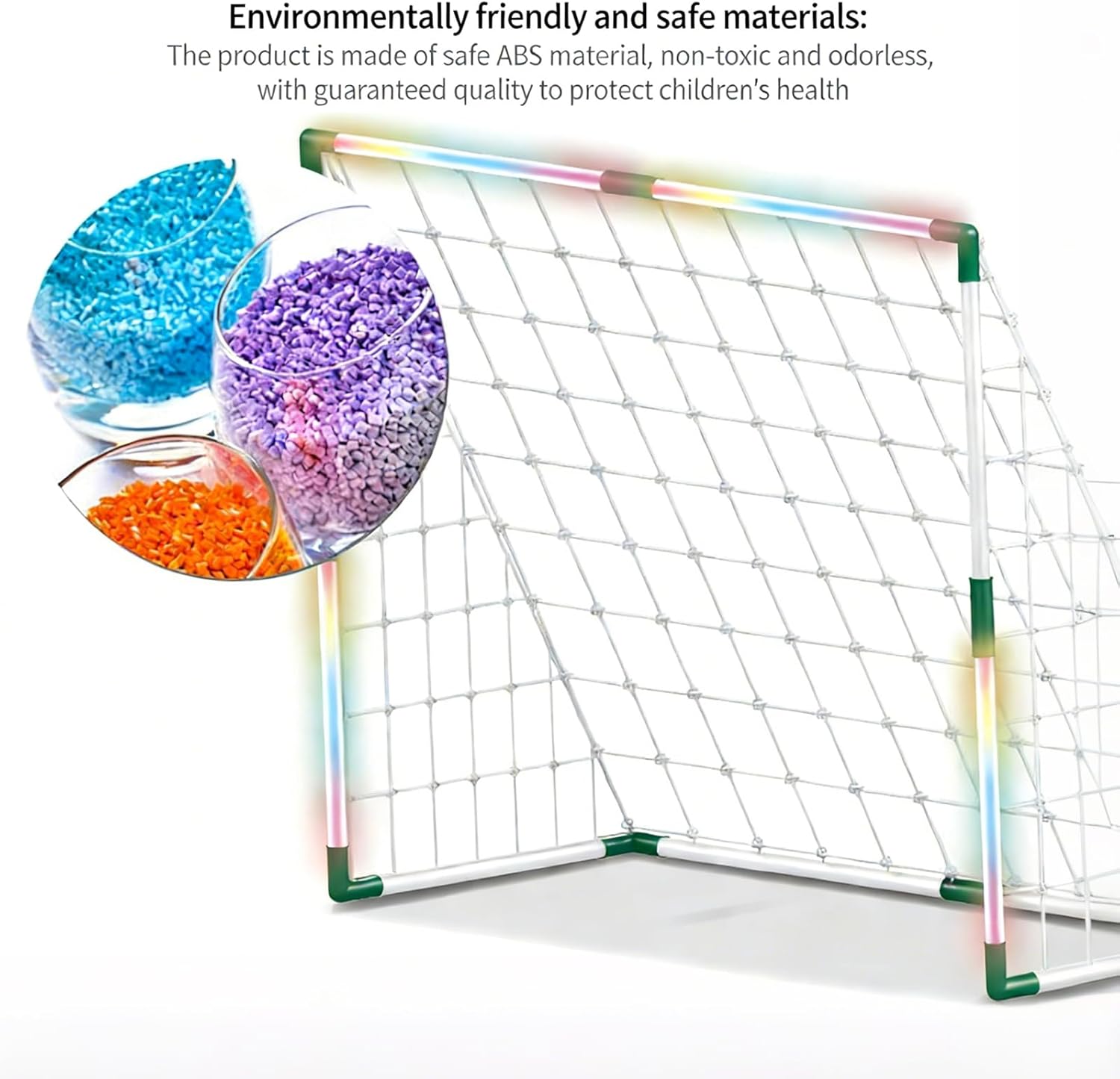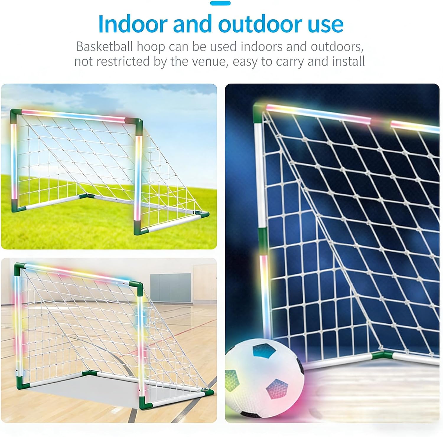 Portable Soccer Goal For Including LED Lights For Evening Games And Family Sports Activities Features: Enhanced Evening Activity: Built in LED lighting provides better for safe play during dim conditions, making this soccer set perfect for backyard and neighborhood areas can enjoy football at different times with added Family Bonding Through Sports: Designed for interactive parent play with single person guarding the goal and another kicking Encourages family moments without screens while building relationships through athletic games Stable Anti Tip Design: Features strengthened base that prevents toppling or bending during active use Rigorously tested for longevity to withstand ' s active soccer contests over repeated use Indoor / Outdoor Versatility: Easy to transport and set up in living rooms, patios, grassy zones or outdoor locations Provides quick football fun both at home or when traveling for spontaneous play occasions Multi Sport Functionality: Works for various ball games beyond soccer, expanding entertainment possibilities for outdoor gatherings Caters to different age groups ' exercise requirements while developing football techniques and coordination skills Specifications: Substance: Size: Standard football goal size, suitable for Practicality: Suitable for outdoor sports, helping to improve ' s football skills and reflexes while increasing the fun of sports Package Includes: ' s Lighted Football Goal Toy Set Note: Before using the accessory, please check it is compatible Pay attention to the storage methods
