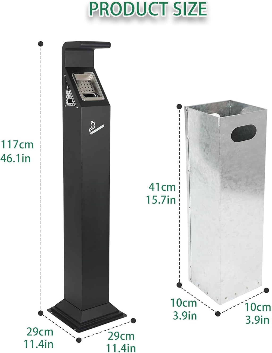 The Ash Column is Sturdy and , the Steel Plate is Not Deformed.adopts the 3-sided opening design, which can be used by many people at the same time.features a lockable design easy access to the trash can with a key.the rainproof top cover can effectively block rain and dew from seeping into the interior.Name: Cigarette butt column/Vertical stainless steel ash extinguisher/floor-standing ashtray/outdoor ashtray, stainless steel smoking barrelProduct Material: Stainless SteelColor: Black, Bronze finish, Stainless steel silverSize: Outer:Length: 29 cm / 11.4 inchesWidth: 29 cm / 11.4 inchesHeight: 117 cm / 46.1 inchesinner hoppers:Length: 10 cm / 3.9 inchesWidth: 10 cm / 3.9 inchesHeight: 40 cm / 15.7 inchesApplicable places: Smokers Outpost for use Outside of Commercial Office,Restaurants, BarsPackage Content:- 1 x Floor-standing ashtray- 4 x screwsNotice:1.Because it is processed by hand, the finished product usually has an error of 1-2 cm, please understand.2.Due to the light and screen setting difference, the item's color may be slightly different from the pictures.