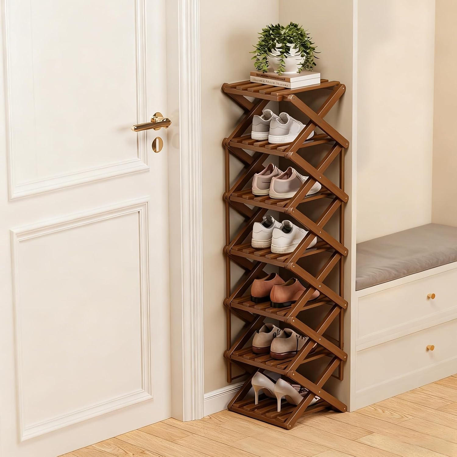 Feature 1.Instant Organization, No Assembly Needed — Unfolds and locks into place in seconds. No tools, screws, or complicated instructions required 2. Space-Saving Vertical Design — Slim 25cm-wide profile fits easily in entryways, closets, corners, or narrow spaces. Tall, multi-tier layout maximizes vertical storage without taking up floor space 3. Durable and Eco-Friendly Bamboo — Made from solid bamboo with smooth, warm finish. Strong, lightweight, and sustainable and visually appealing material 4. Multi-Purpose Functionality — Ideal for organizing shoes, books, plants, décor, or pantry items. Serves as a versatile storage solution for various rooms and purposes 5. Foldable & Easy to Store — Collapses completely flat. Perfect for renters, frequent movers, or small living spaces 7. Easy Maintenance — Smooth bamboo surface allows quick wipe-down cleaning. No hassle, keeps your storage area neat and hygienic Specifications Product Name: Folding Multi-Tier Organizer Rack Material: Bamboo Dimensions: Width 9.8 in / 25 cm (varies by tier/height option) Functions: Vertical tiered storage; fold-and-lock setup; folds flat for storage Use Scenarios: Entryway, closet, apartment, hallway, bedroom, bathroom, pantry Care: Wipe clean with a damp cloth Tiers: 3/4/5/6/7/8/9 fixed shelves Assembly Required: None – unfolds instantly Color Options: Brown, Natural
